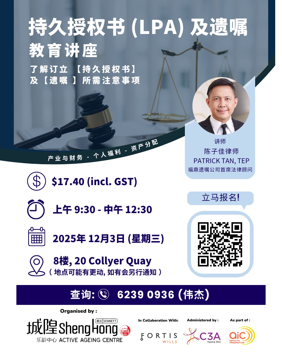 活动简介:通过讲座了解持久授权书和遗嘱的区别、如何订立持久授权书和遗嘱以及制定该文件的好处和所需考虑事项。