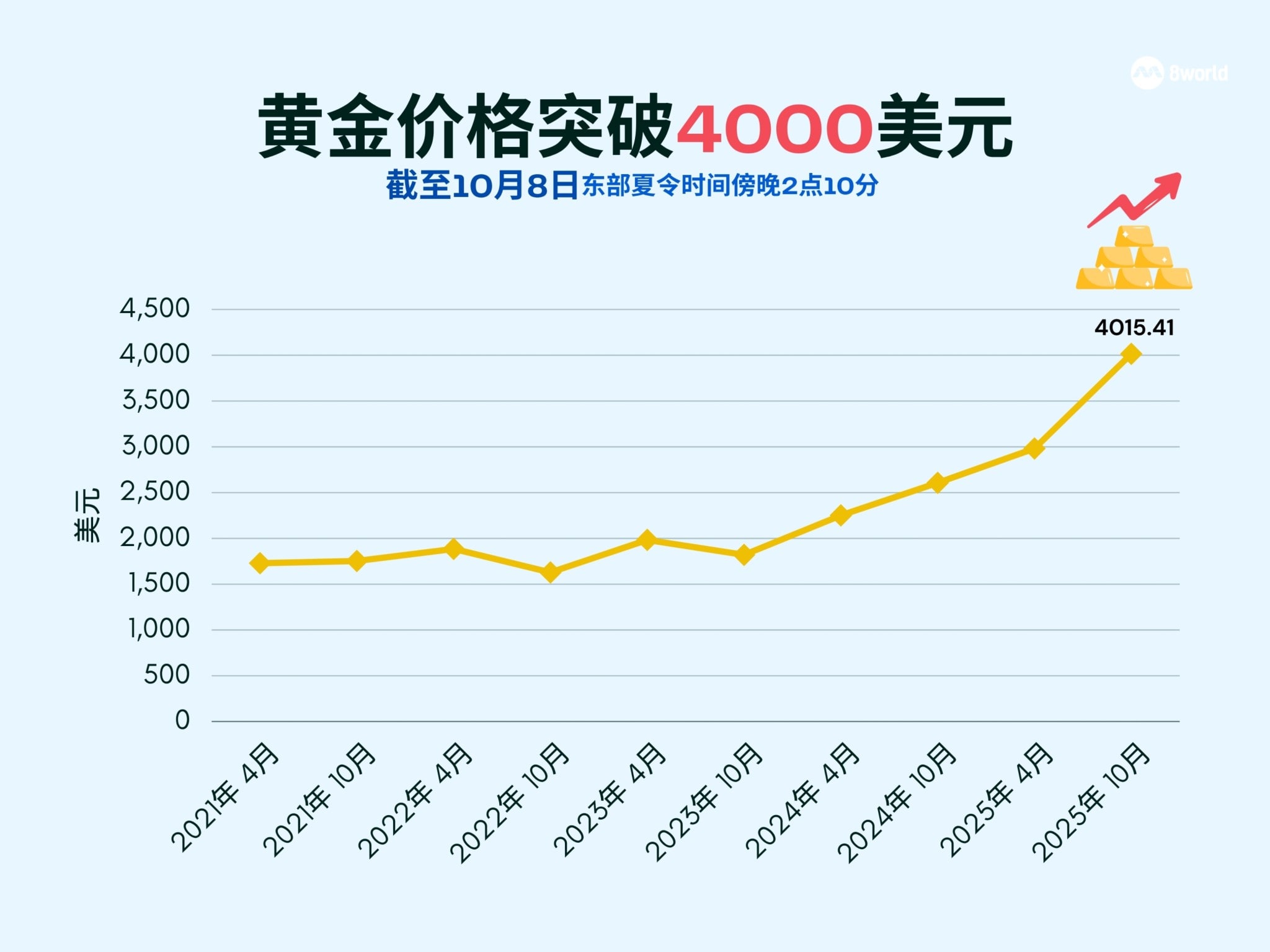 黄金期货突破每安士4000美元大关 创下新高 财经 发布: 08 Oct 2025 07:04 更新: 08 Oct 2025 22:49 黄金。(图:法新社) 新功能! 听新闻,按这里! 我要听,按这里! 知道了 听新闻 我要听 正在听 暂停 分钟 此音频由AI生成 UH-OH! 难免有故障。请稍后再试。 词典 新功能 查看词典,学华文! 知道了 点击文内词语,看词语解释、发音及翻译 知道了 字号 极小 小 中 大 特大 收藏   收藏 分享 8world Email 8world Whatsapp 8world Facebook 8world Telegram 8world Wechat 8world Twitter 8world Weibo 黄金期货突破每安士4000美元大关,创下新高。在美国隔夜市场,美国12月份黄金期货每安士一度攀升到4014.6美元;现货也创下3990.85美元的纪录。交易员说,美国联邦政府局部停摆,提高了避险需求,支持金价走高。分析预测,由于没有迹象显示,美国政府停摆会在短期内结束,金价仍有上涨的空间。 相关标签 黄金 gold 金价 Gold prices 订阅电邮简报 每日接收头条新闻内容 Subscribe now 下载《8视界》应用程序 一机在手,掌握天下事 Download App 加入Telegram群组 天天送上精选好内容! Join now