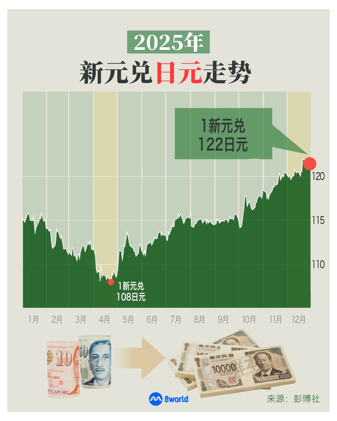 随着日本财政政策明显扩张、经济增长预期上调,加上日本央行或在年底前加息,因此日元在2026年有可能跑赢所有七国集团(G7)货币;新元兑日元则有望达至117水平。