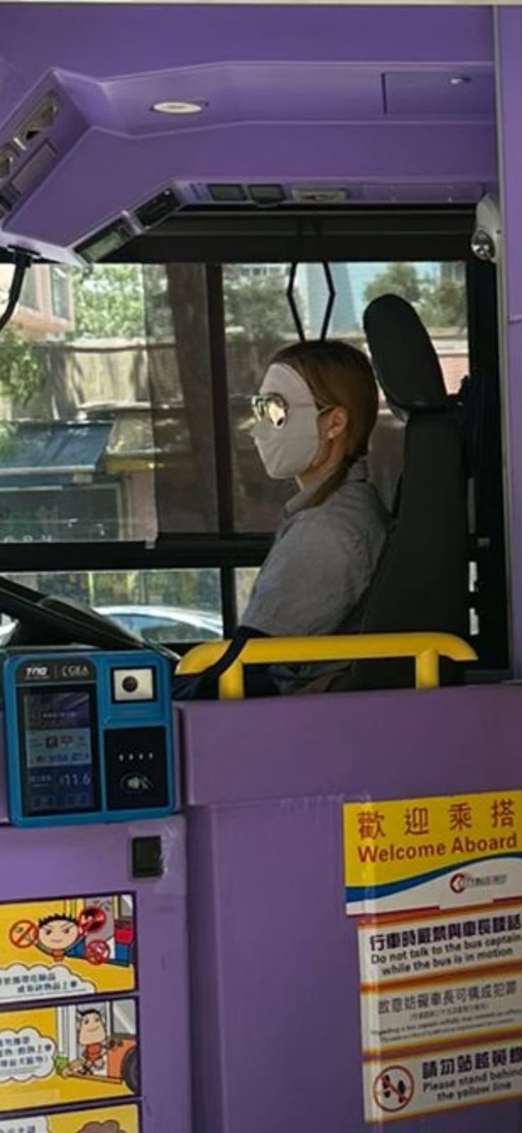 白色面罩遮住整张脸,再加上一副太阳眼镜,香港一名车长在开巴士时以吸睛造型出现,引起热议。