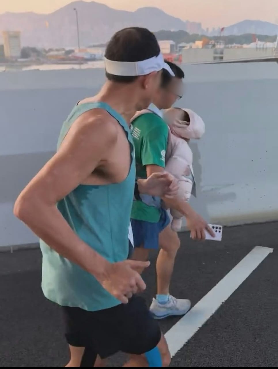 香港01报道,香港渣打马拉松赛于星期天(18日)举行,根据当日在网上流传的视频显示,该名戴着眼镜的中年男子在西九龙一带跑向昂船洲方向时,前方以背带固定一名婴儿,后方则背着背包,并把参赛号码布扣在婴儿的防风被上。