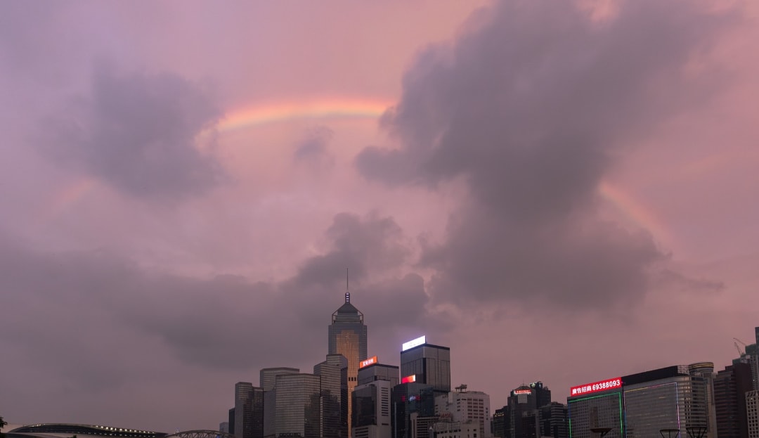 此外,当时傍晚天空变色,雨后的天空又粉红又紫色,与平时看到的黄昏不同,也有不少人拍到彩虹高挂的情景。
