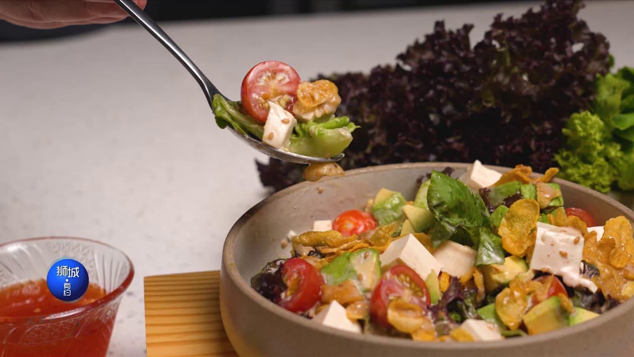 将樱桃番茄切半,再把豆腐切成小块状,之后给牛油果去皮,然后切成同豆腐大小块状,方便入口。手撕生菜放入盘中垫底,加入樱桃番茄、牛油果和豆腐,撒上玉米片增添香脆口感,最后淋上芝麻酱就可以上桌了。