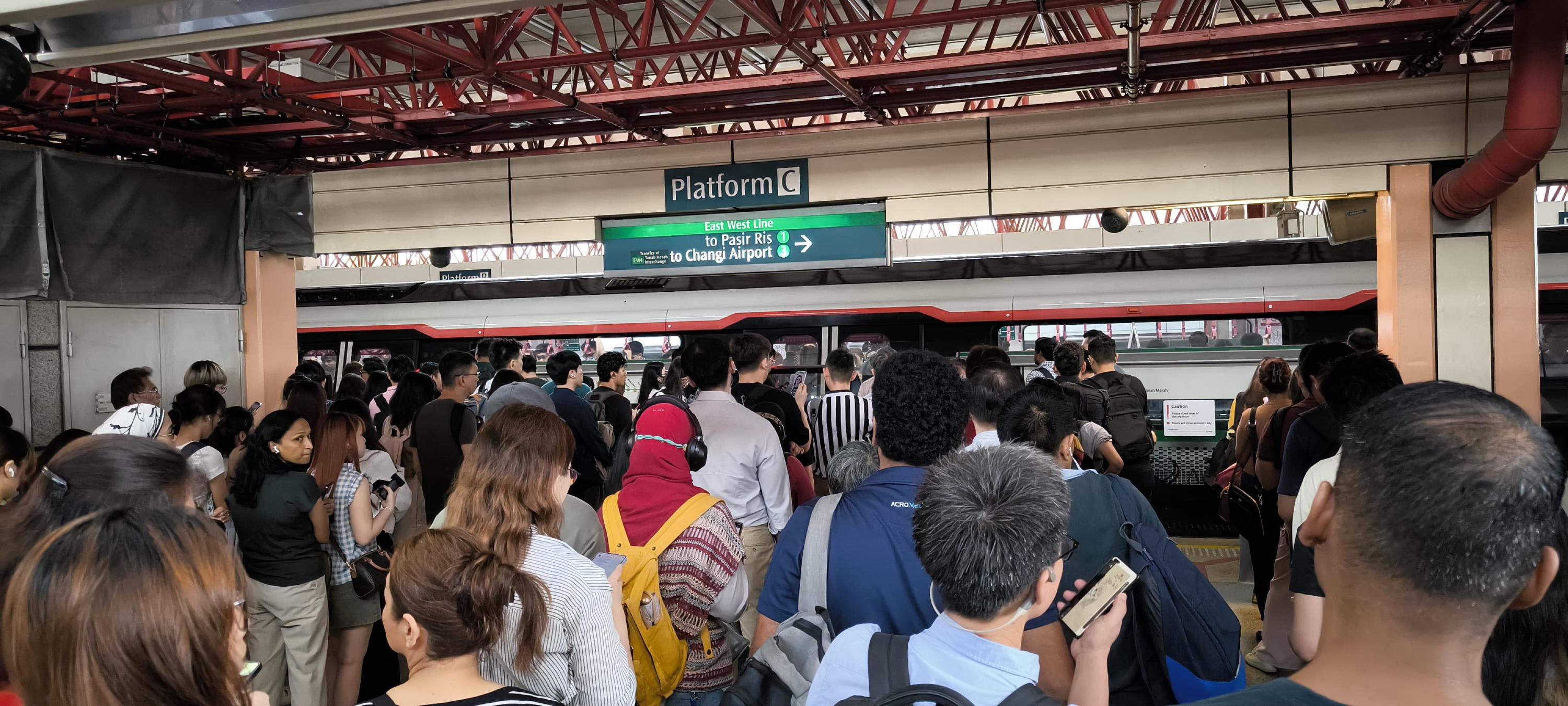 地铁东西线的转轨器发生故障,导致部分列车服务延误。图为裕廊东地铁站内的情况。(图:读者提供)