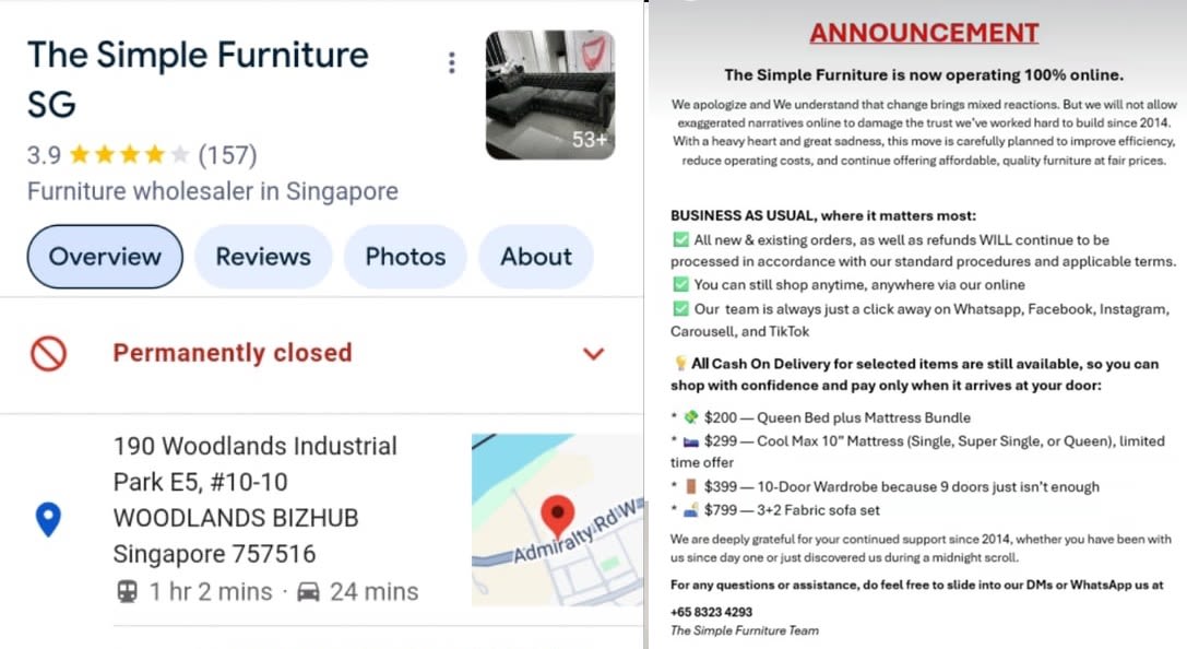 公司于8月8日在网上张贴告示说,仍在线上运营,但买家发现谷歌资料显示公司已经停业。(图:Irfan/Instagram/The Simple Furniture)