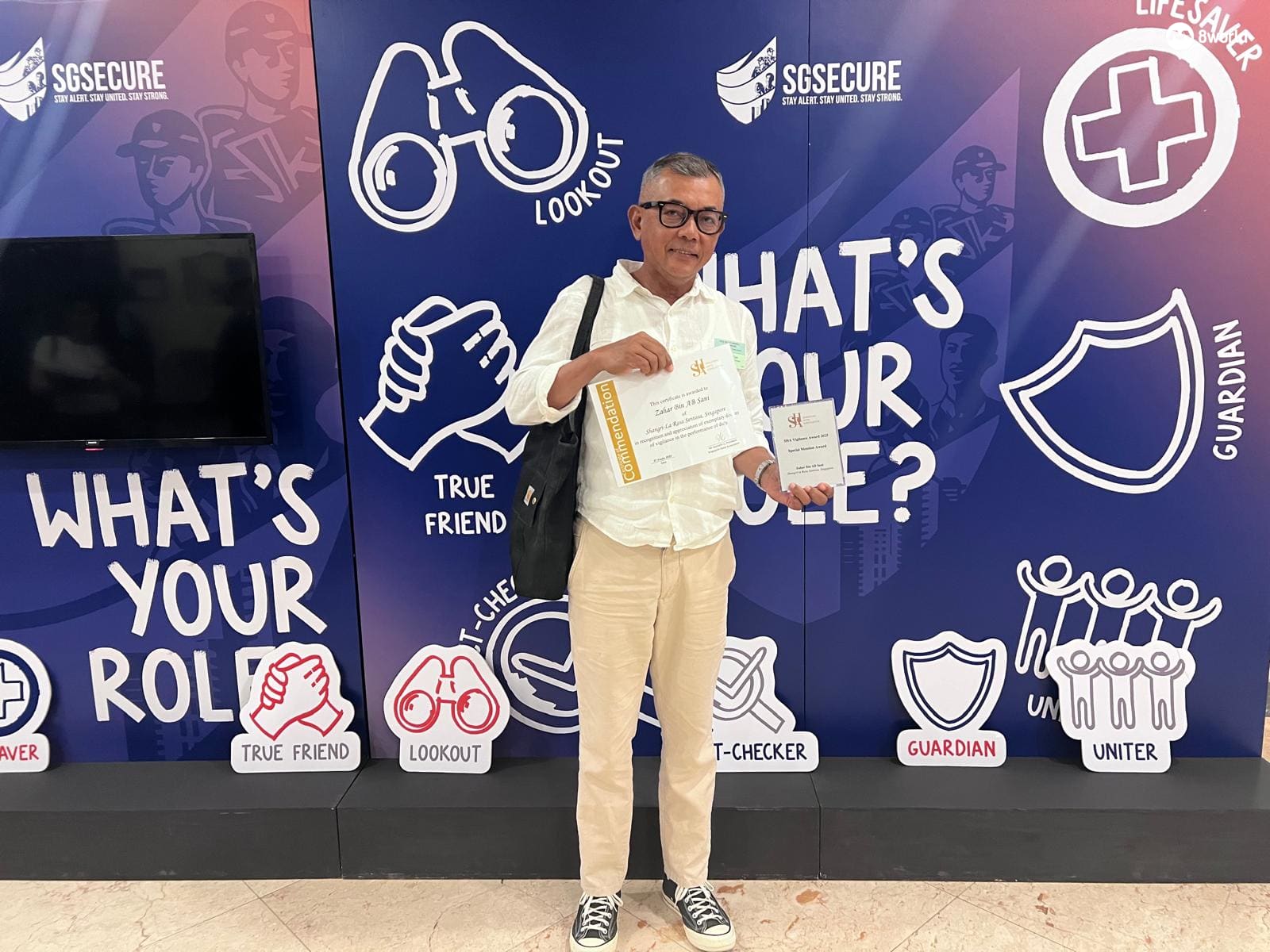 来自香格里拉圣淘沙度假酒店的54岁救生员扎哈尔是"警惕奖"得主之一。今年一月,三名可疑男子在酒店泳池附近试图接近客人。扎哈尔凭借敏锐的直觉向前拦住他们,并要求出示房卡,导致其中一人慌张逃跑。他随后通知安保部门,禁止他们再次进入酒店设施。