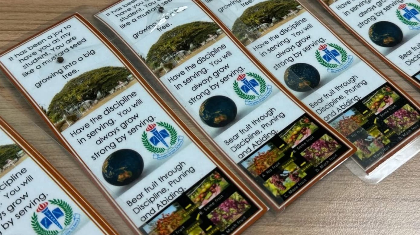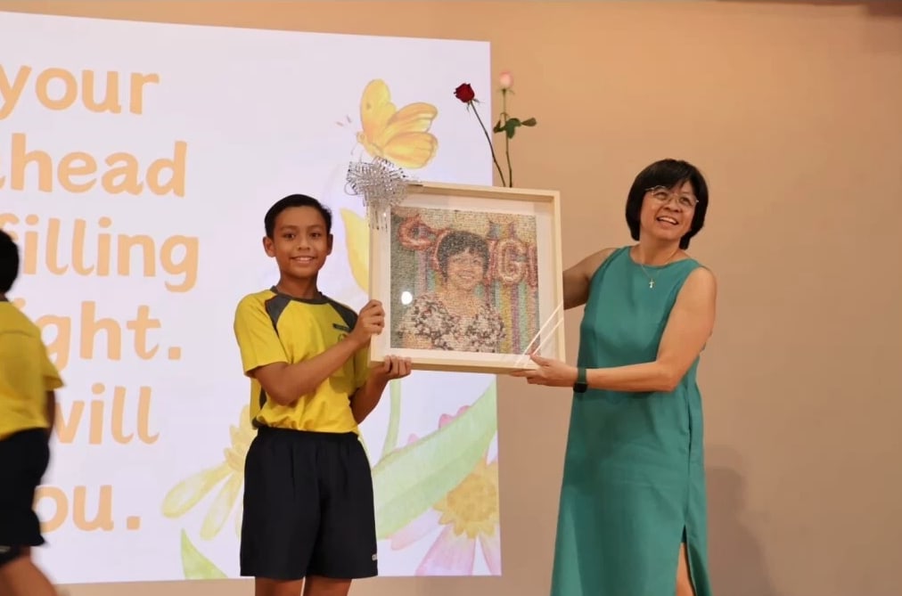 从尚育小学“毕业”荣休的郑慧婷,从学生手中接过谢礼。(图:尚育小学)