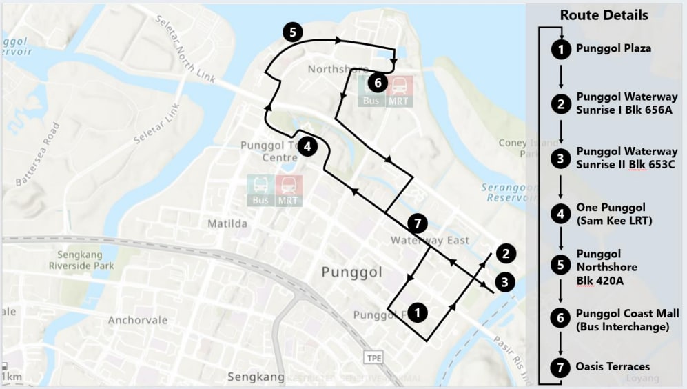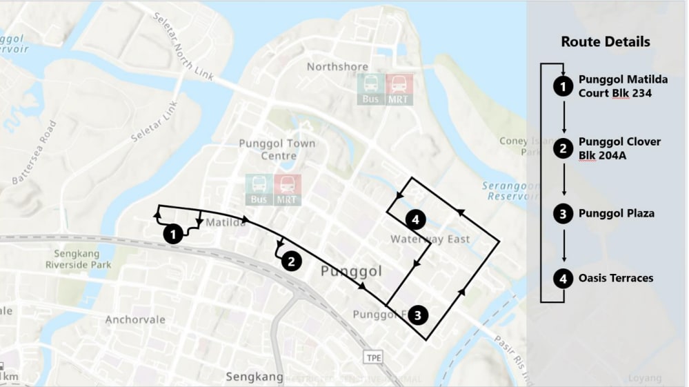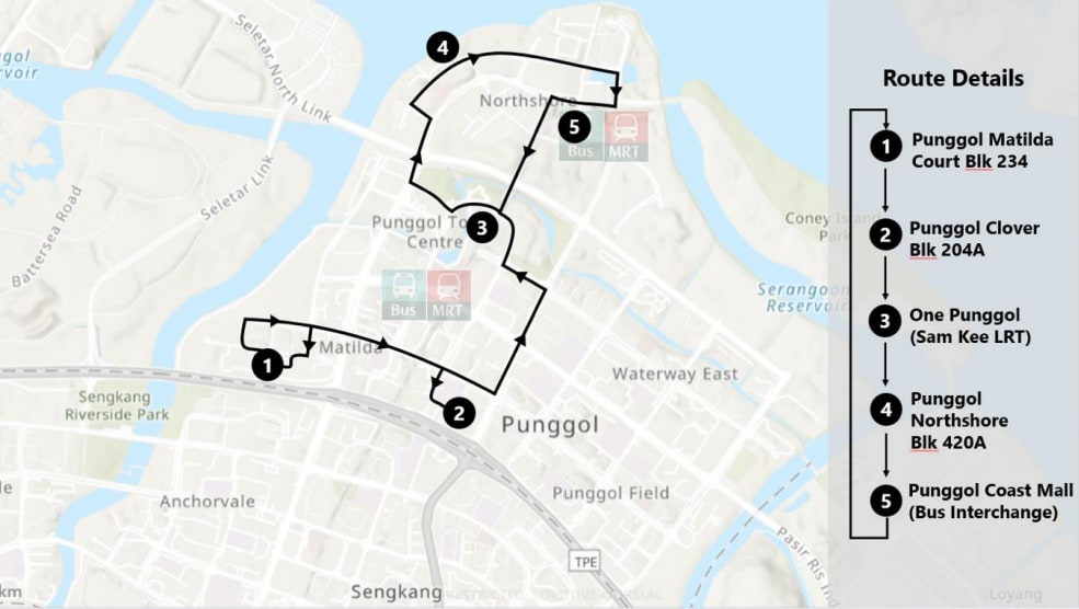 由Grab运营的路线一会往返榜鹅东西区,全长10公里,接载Matilda Court组屋和榜鹅Clover的居民到绿洲台的综合诊疗所,以及榜鹅生活聚场(Punggol Plaza)的巴刹。这条路线全程约35分钟,比现有的公共交通选项节省约10分钟。
