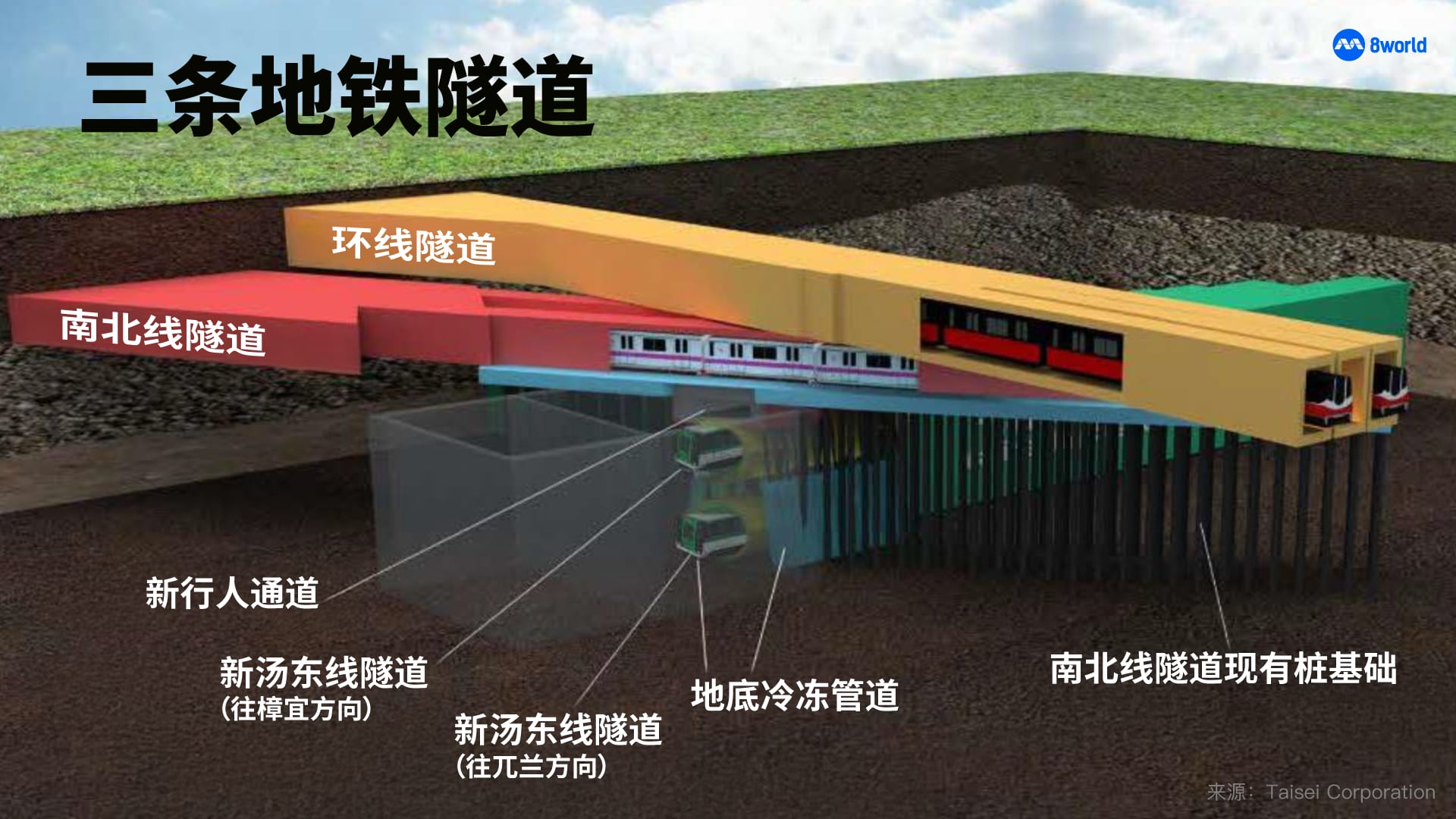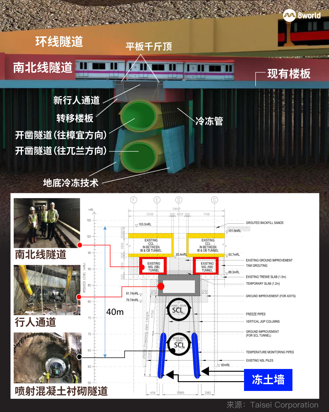 这个新地铁转换站毗邻南北线与东西线,必须在不影响地铁运营的情况下开凿隧道。隧道施工不仅要跨越旧有钻孔灌注桩(bored piles),更要克服高水压与松软海泥层的风险。