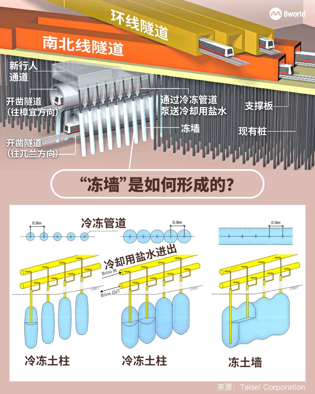两人采用先进的电脑模拟来规划施工,并研发特制切割机清除阻碍的桩柱。在最关键的突破上,他们引入地底冷冻技术(ground freezing),将冷却用盐水(brine)降至零下30摄氏度,并注入地下,使泥土冻结成厚达1.8米的“冻墙”。这些冻墙形成防水屏障,让隧道开凿能在安全、干燥的环境下进行。