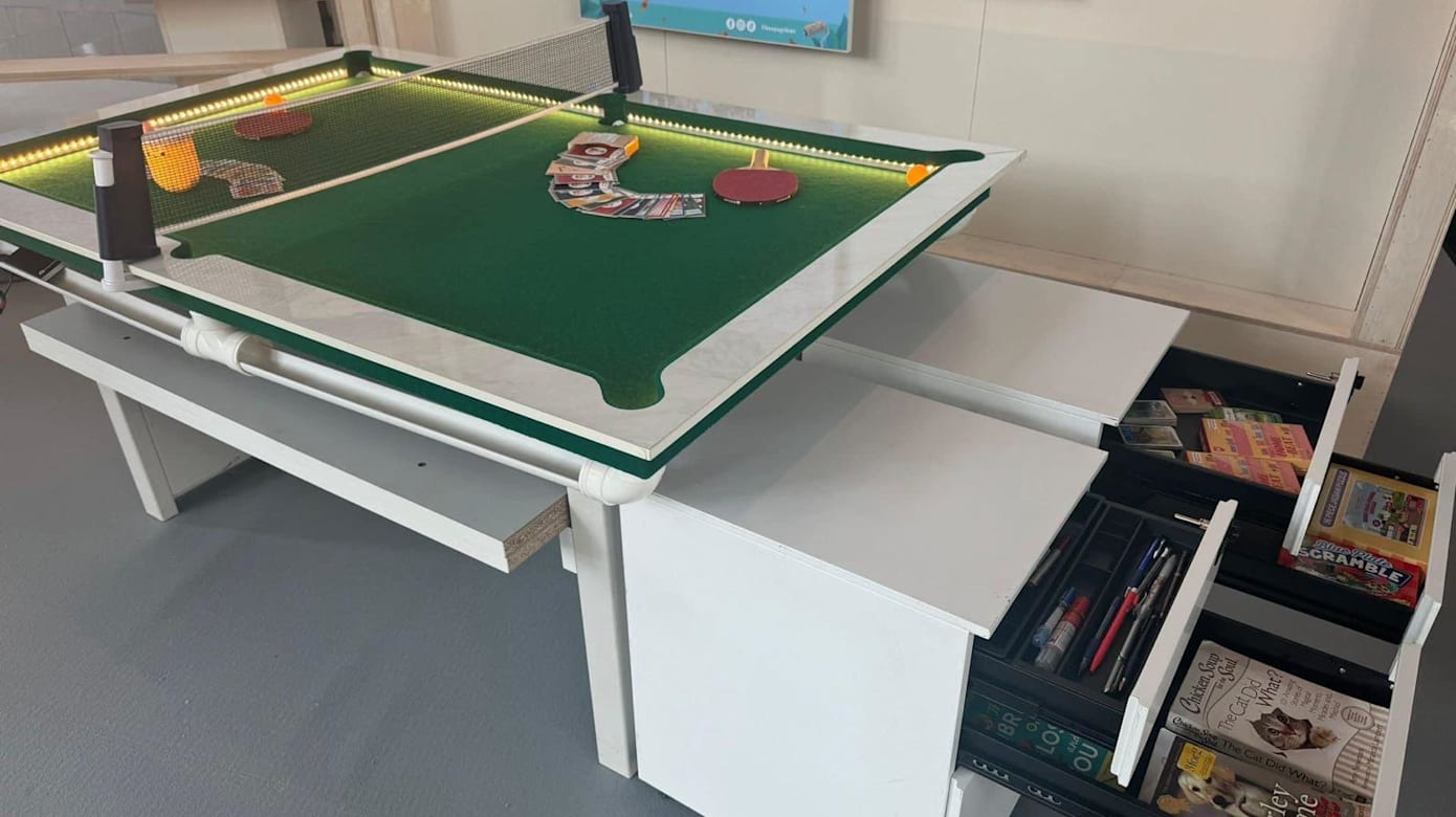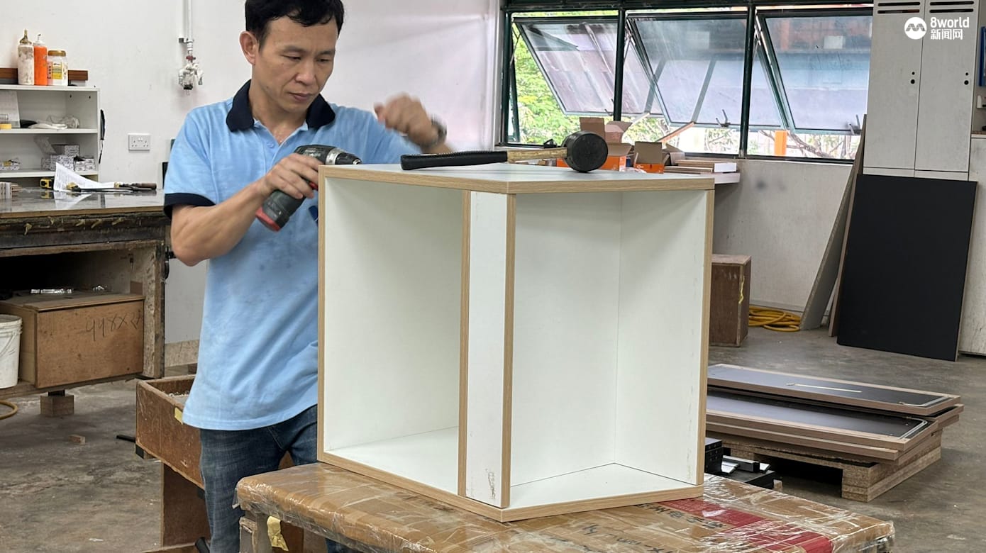 公司销售主管谢双惠以旧办公桌为例指出,公司在检查完桌子的情况后,就会把可用的部分切成块,然后进行修饰和拼接,再加上轮子,就能做成一个新的茶几。