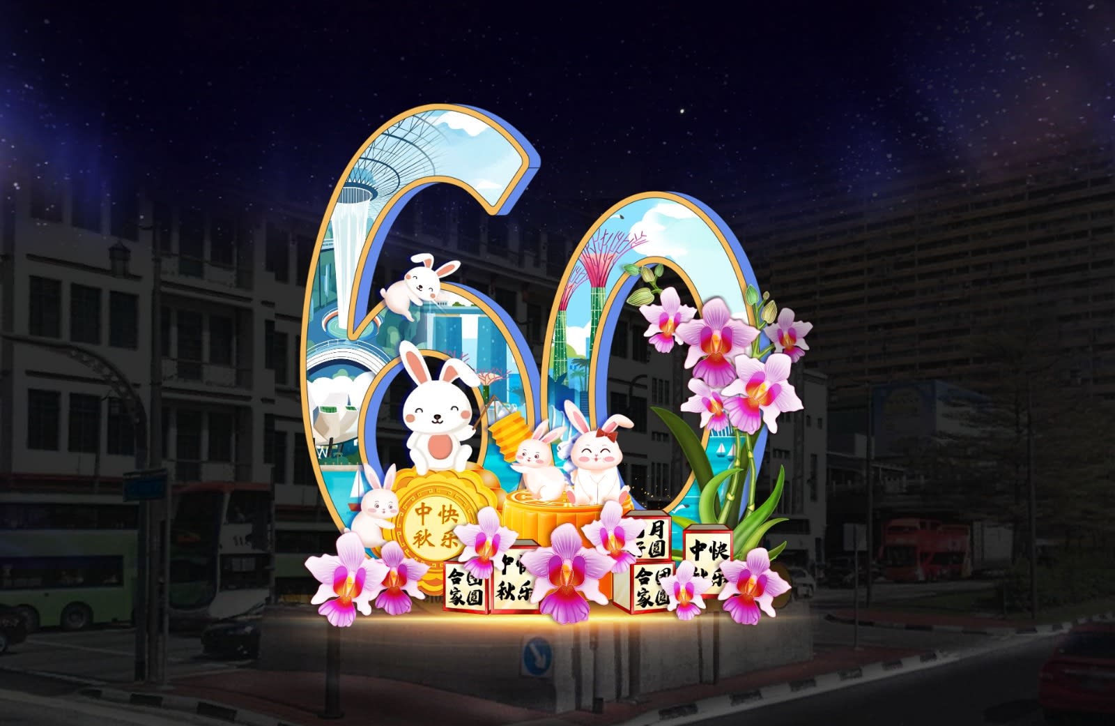 为欢庆我国建国60周年,今年的牛车水中秋节灯饰也融入SG60元素,并以“辉煌六十载,月满新加坡”作为整体设计的主题。