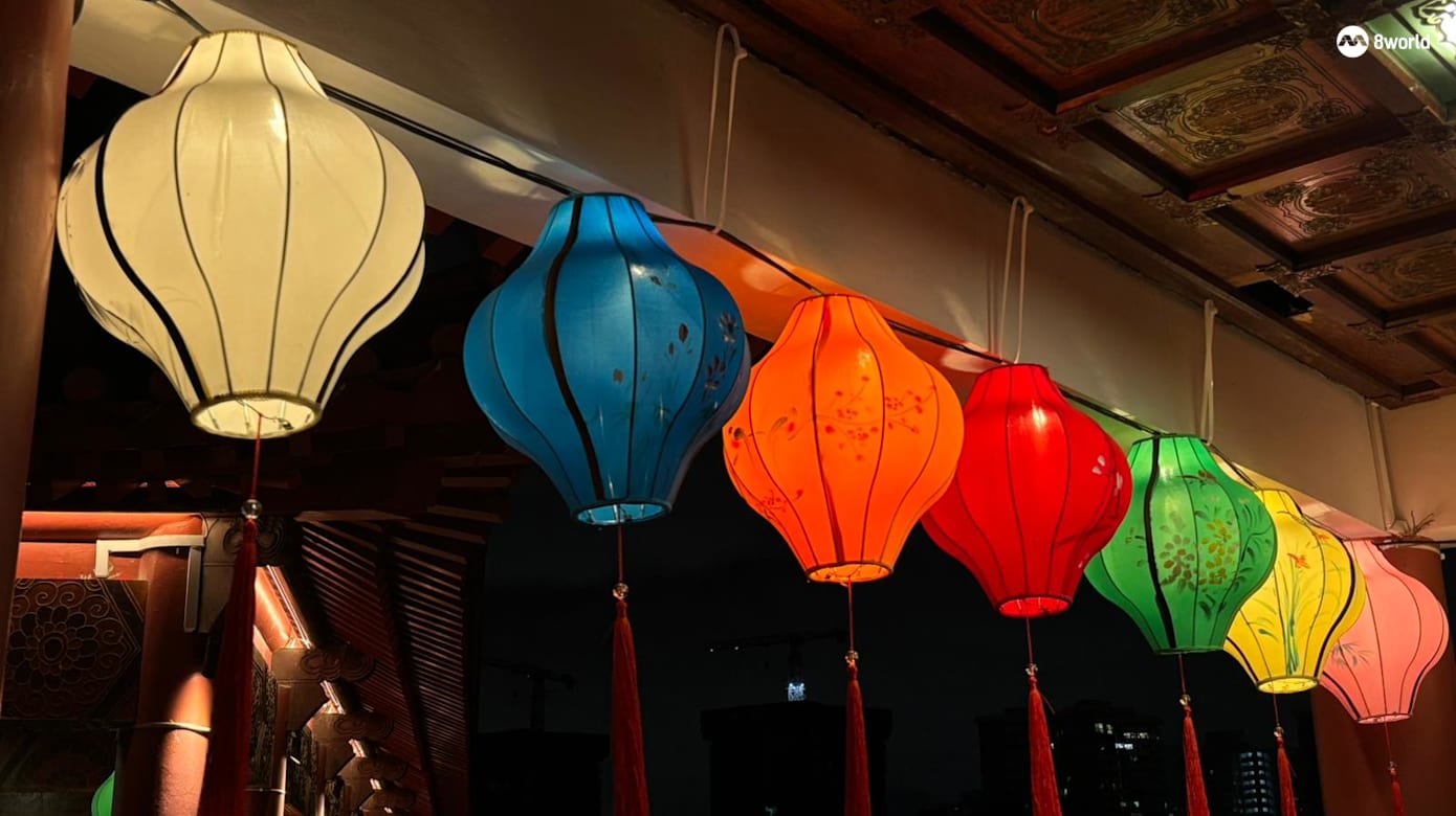 云月双塔、和风茶室和邀月舫每晚7点过后也会亮灯。三处挂上不同风格的灯笼,有传统的、淡雅的和缤纷的,让访客感受不同氛围。