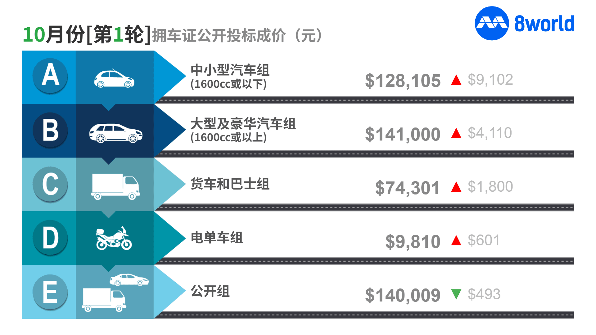 中小型车组标价突破12万元 再创新高 新加坡 发布: 08 Oct 2025 16:15 更新: 08 Oct 2025 21:00 新功能! 听新闻,按这里! 我要听,按这里! 知道了 听新闻 我要听 正在听 暂停 分钟 此音频由AI生成 UH-OH! 难免有故障。请稍后再试。 词典 新功能 查看词典,学华文! 知道了 点击文内词语,看词语解释、发音及翻译 知道了 字号 极小 小 中 大 特大 收藏   收藏 分享 8world Email 8world Whatsapp 8world Facebook 8world Telegram 8world Wechat 8world Twitter 8world Weibo 本月份第一轮拥车证投标结果出炉。中小型车组标价突破12万元,再创历来新高。中小型车组大涨9102多元,报大约12万8105元。大型及豪华车组起4110元,新标价14万1000元,创今年来最高。唯一下滑的公开组微跌近493元,新标价大约14万零9元。货车及巴士组起1800元,报大约7万4301元。摩托车组上涨大约601元,新标价9810元。 相关标签 COE 拥车证投标价 订阅电邮简报 每日接收头条新闻内容 Subscribe now 下载《8视界》应用程序 一机在手,掌握天下事 Download App 加入Telegram群组 天天送上精选好内容! Join now