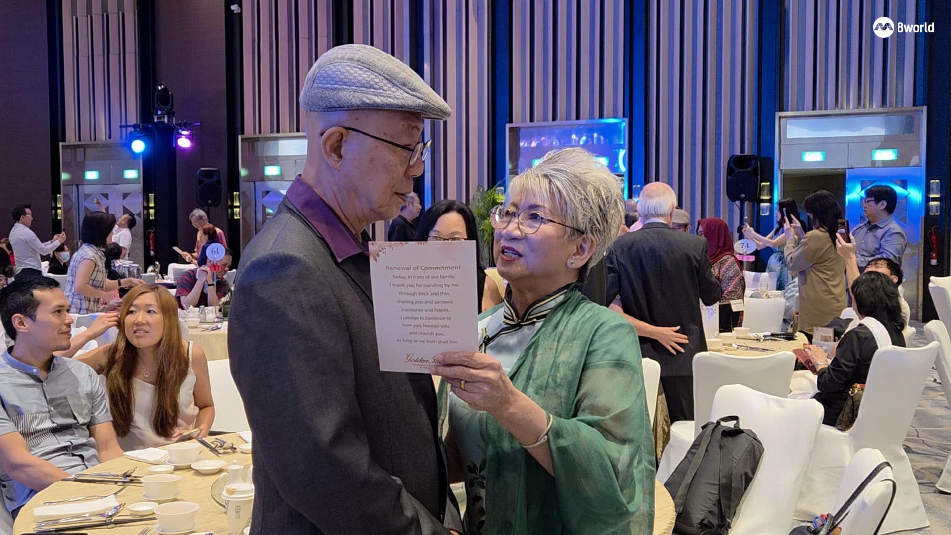 两人在庆典上重新宣誓婚约时,太太依偎着先生,格外甜蜜。当被问及有什么话想对太太说,沈天成腼腆地说:“最重要是我们现在开开心心,都已经在一起50多年了,希望我们接下来有空就去走走,一起旅行,这才是我们现在人生最重要的。”