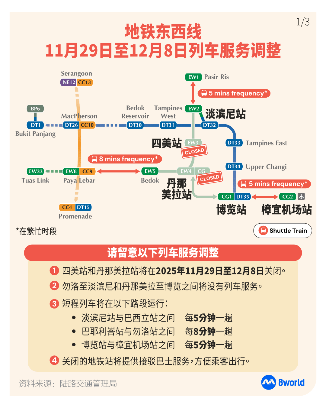 当局提醒,受影响地铁站和巴士站预计将出现拥堵,通勤时间可能延长最多30分钟。乘客应提前规划行程,并通过MyTransport.SG手机应用程序或陆交局与SMRT的社交媒体平台获取最新信息。