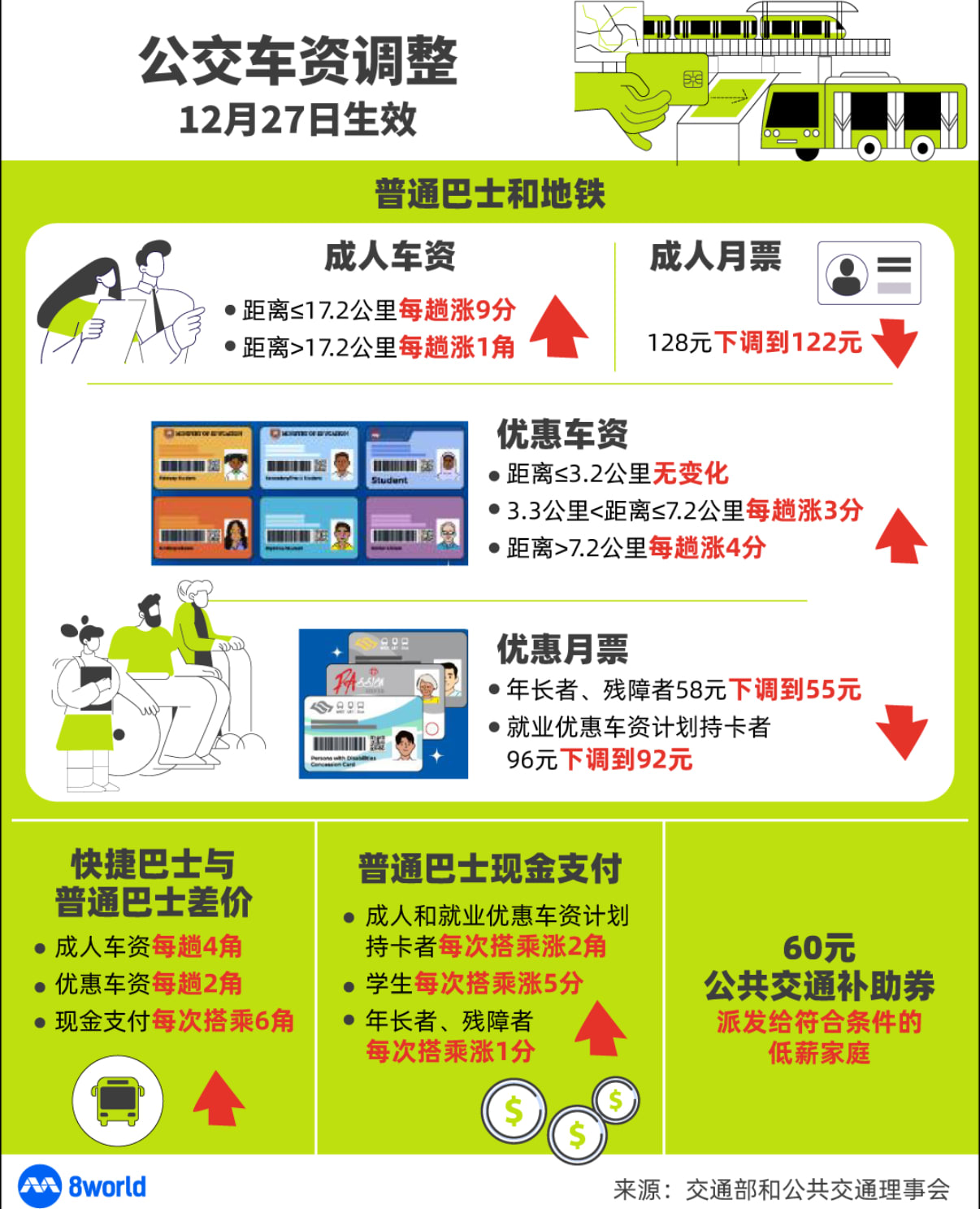 公共巴士和地铁车资将于12月27日起整体上调5%,涨幅低于去年。政府在原有每年逾20亿元的公共交通运营补贴之上,再额外投入2亿元,以抵消今年延后车资调整的成本。