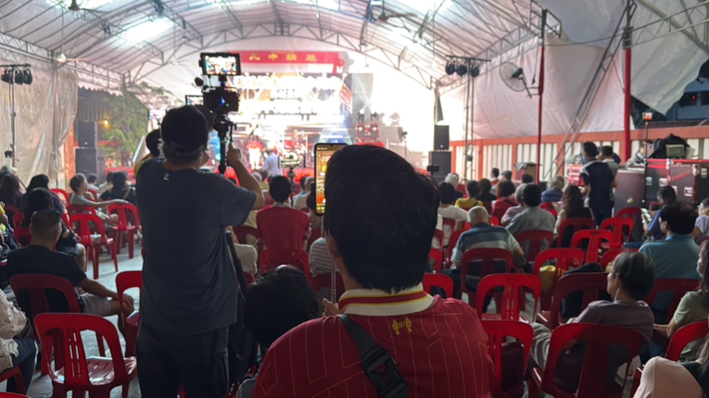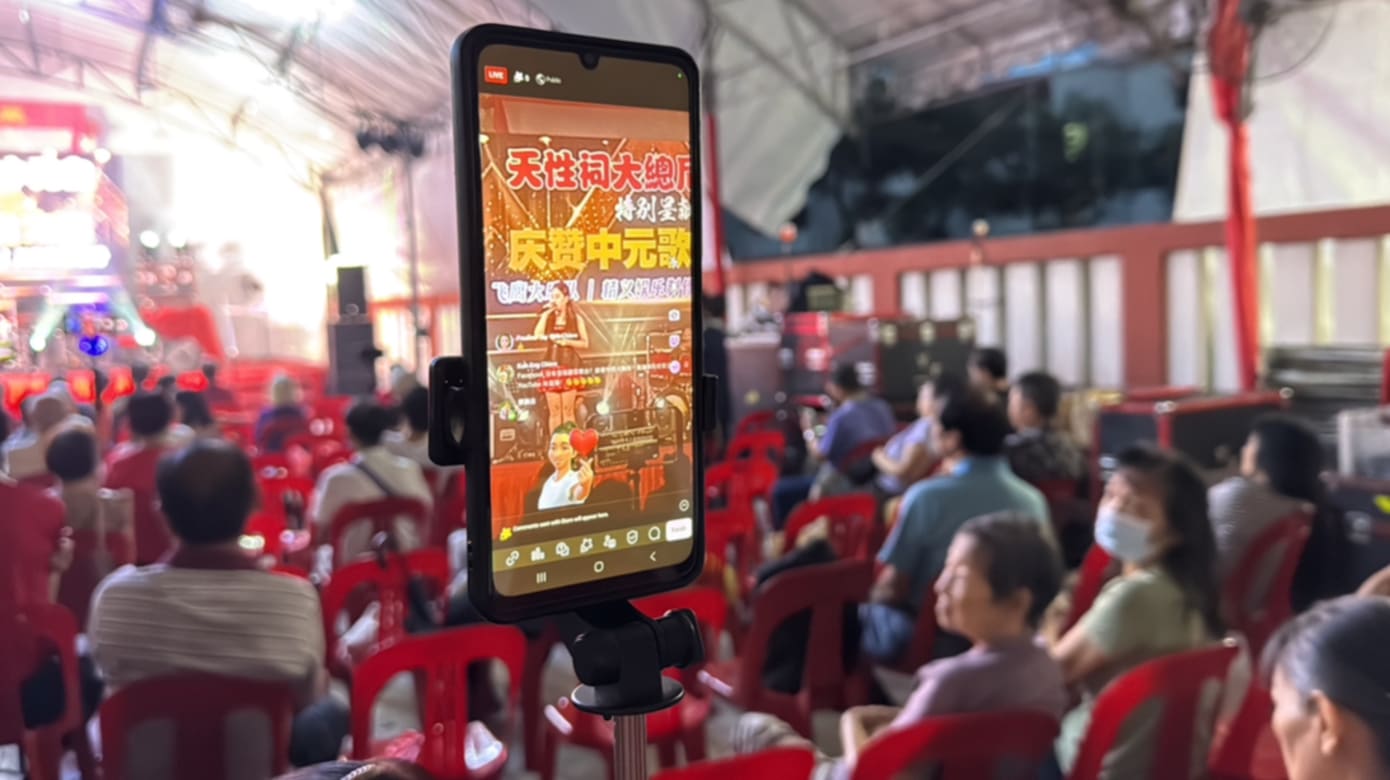 这些冷嘲热讽,他已经听了七年。即便如此,每年农历七月一到,他仍抱着一部手机、一支脚架,走遍新加坡大街小巷,把歌台文化实时送到网民眼前。