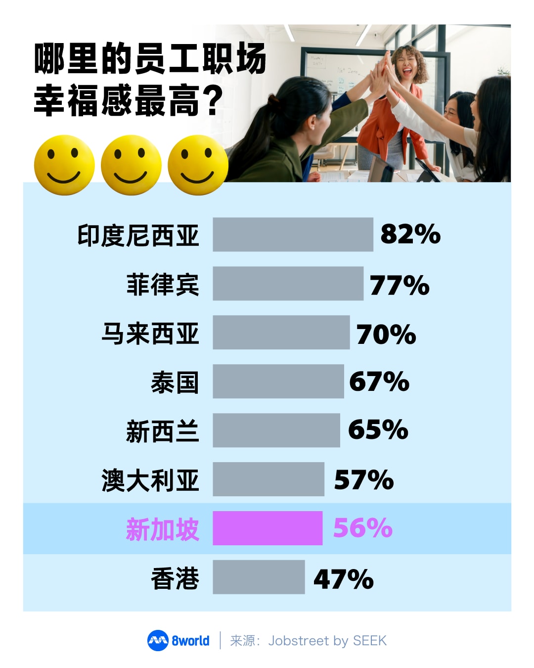 结果发现,新加坡雇员的职场幸福感指数仅比香港(47%)高出些许,并和澳大利亚(57%)相约,但远低于印度尼西亚(82%)、菲律宾(77%)、马来西亚(70%)、泰国(67%)和新西兰(65%)。