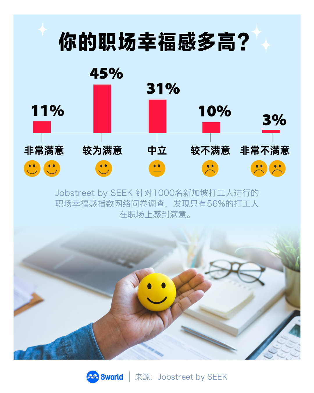 求职网站Jobstreet by SEEK去年10月到11月,针对1000名新加坡打工人进行了职场幸福感指数的网络问卷调查。