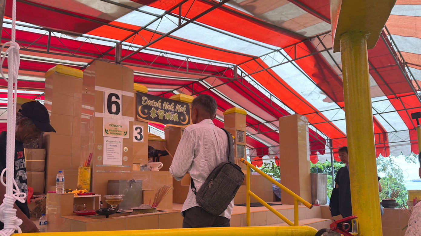 龟屿岛山顶的拿督公祠,香客依旧上山祈福,但庙的一角堆满建筑材料,屋顶仍未修复。