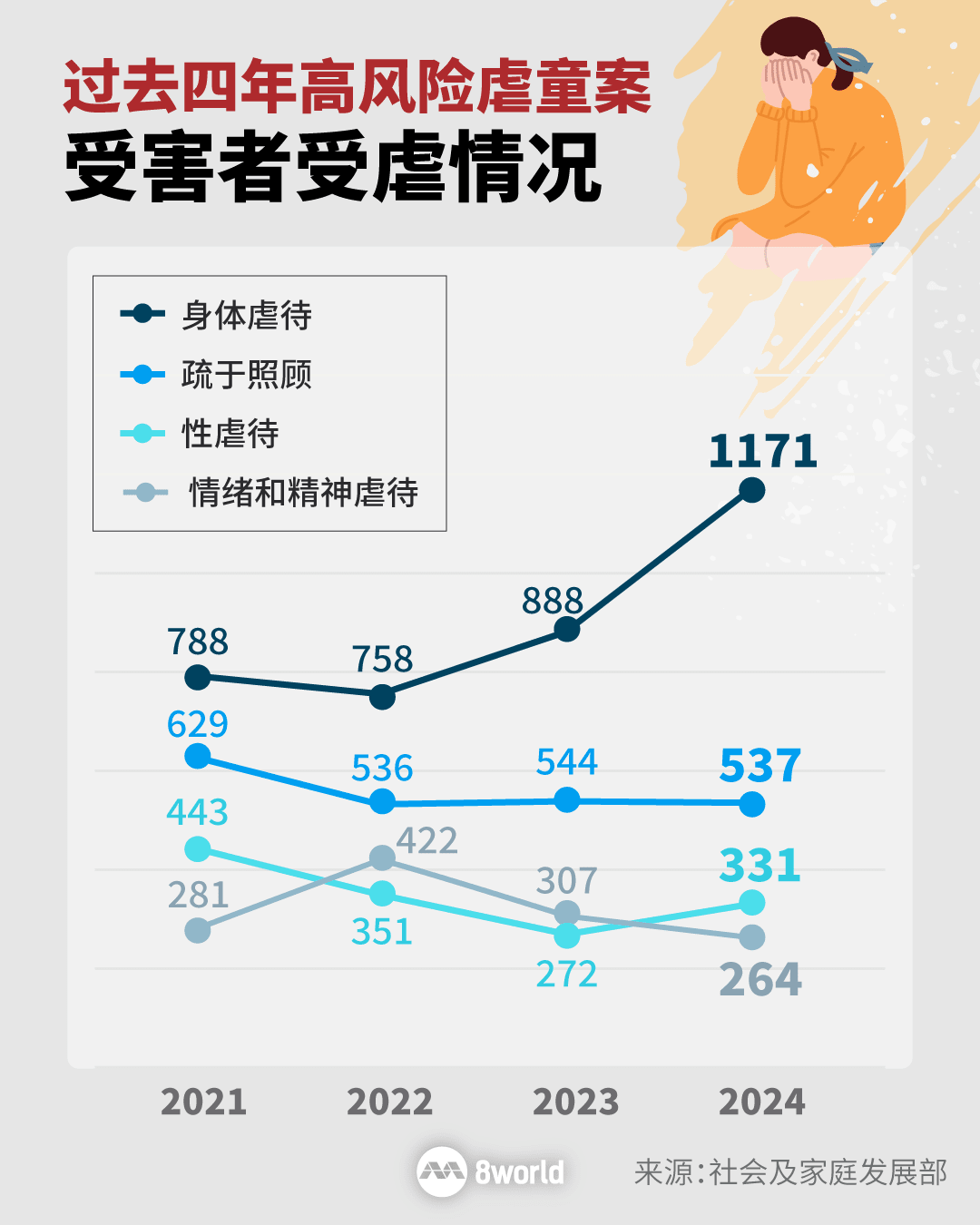 虐童案方面,去年共有3292起第一等级新儿童虐待个案,比前年的2787起,多出505起。过去四年,这个趋势也逐年上升。