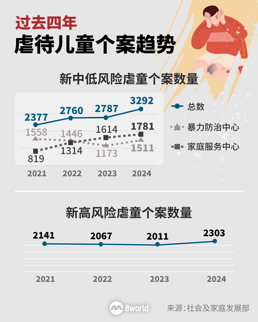 整体而言,本地的第二等级高风险虐童案的案发率,去年每1000名孩童中少过三人,比其他国家低。例如,以澳大利亚来说,2022年至2023年,每1000名孩童有21人遭严重虐待。
