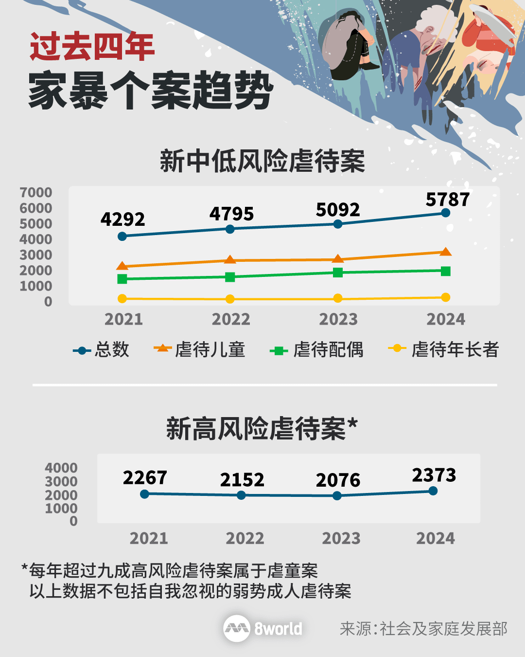 本地家暴新个案从2023年到2024年增加了约14%。其中,中低风险的新虐童个案有超过3000起,增幅同比达约18%。
