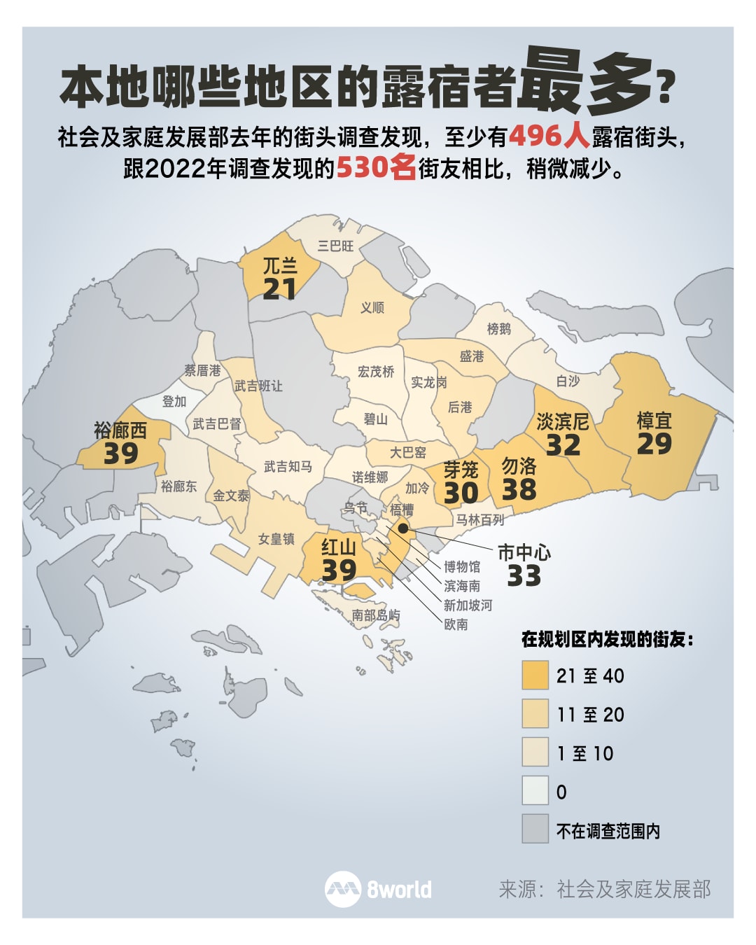 调查发现,去年至少496人露宿本地街头,同2022年的530人相比小幅下跌。 这些人主要露宿组屋区,公园或商业场所。一些人的问题可能根深蒂固,包括情况复杂、不愿寻求援助等。
