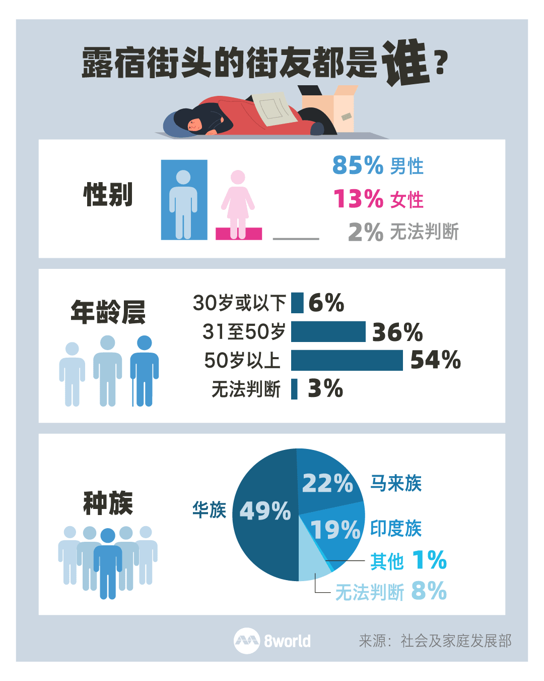 社会及家庭发展部去年7月到8月,动员超过800名义工和社工在全岛计算街头露宿者,总计496人,比2022年的530人少34人。当中大部分是男性,占了85%,而大部分都是50岁以上,占了54%。同时,华族比例占了49%,马来族则有22%,印度族为19%。