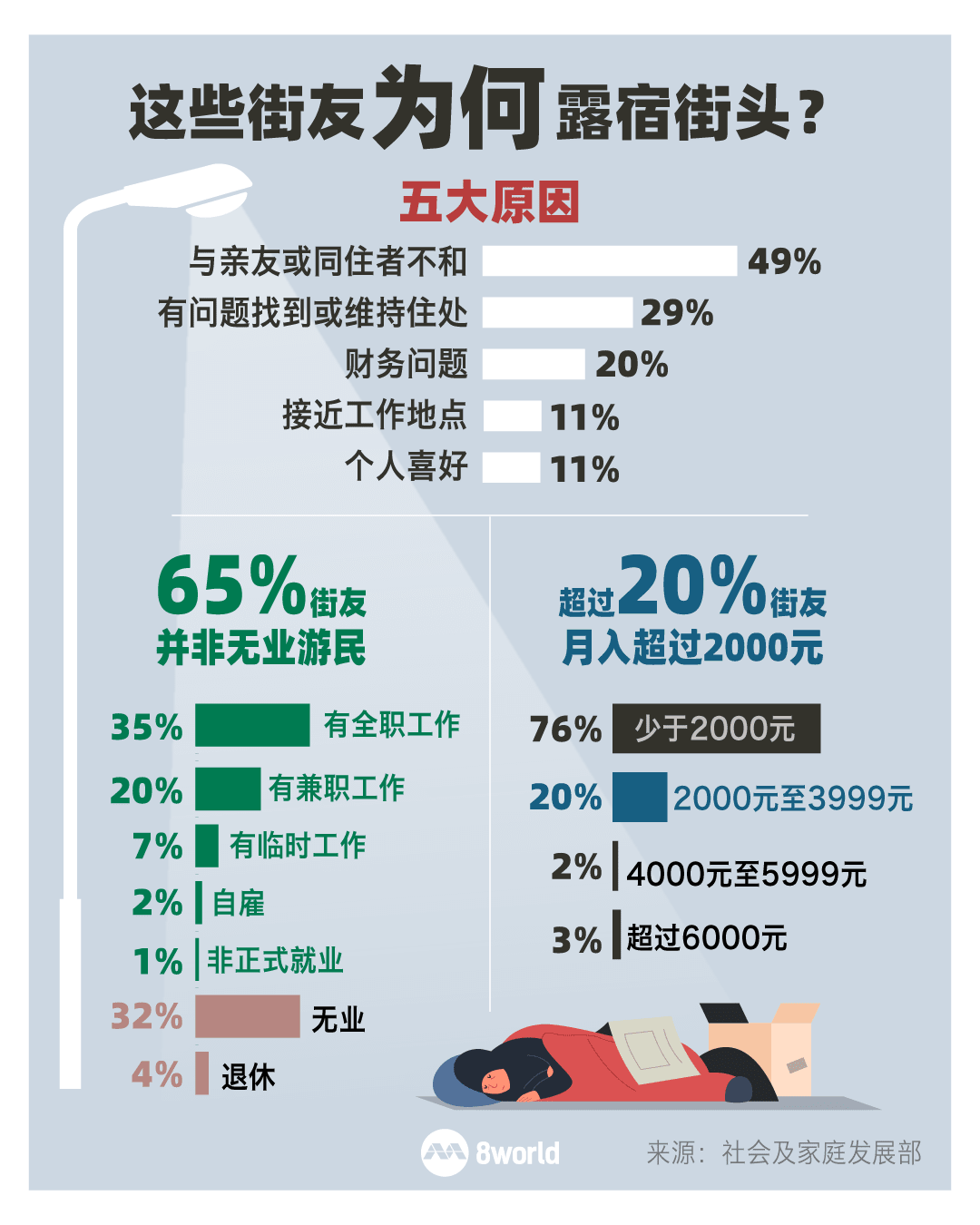 当局也同128人进行调查访问,发现77%的人露宿街头超过一年,约一半说主要因与亲友或室友不和才露宿街头,其他原因包括难以找到或保留住处,以及财务问题等。这些原因跟当局在2022年的调查结果相似。