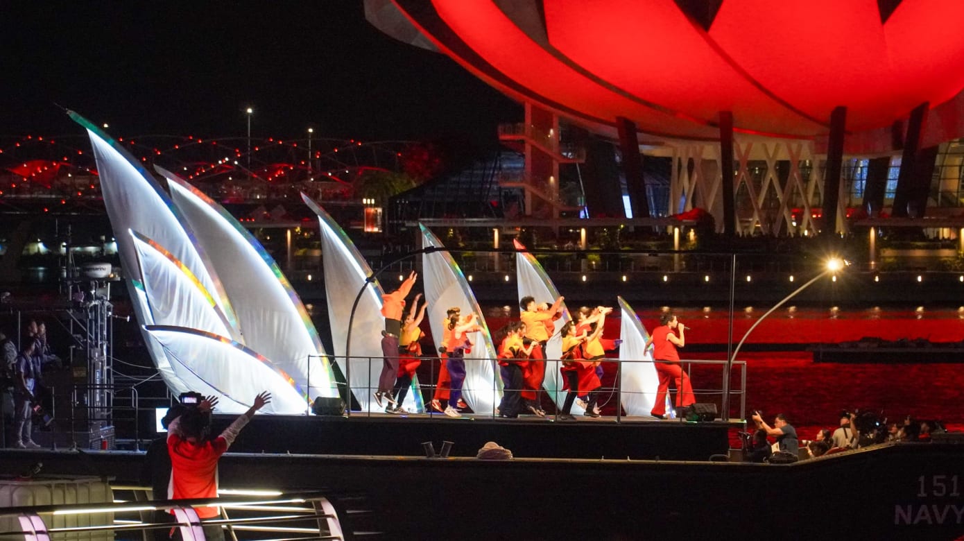 随着政府大厦前大草场的演出依次展开,滨海湾水域的花车和流动舞台也同步登场。