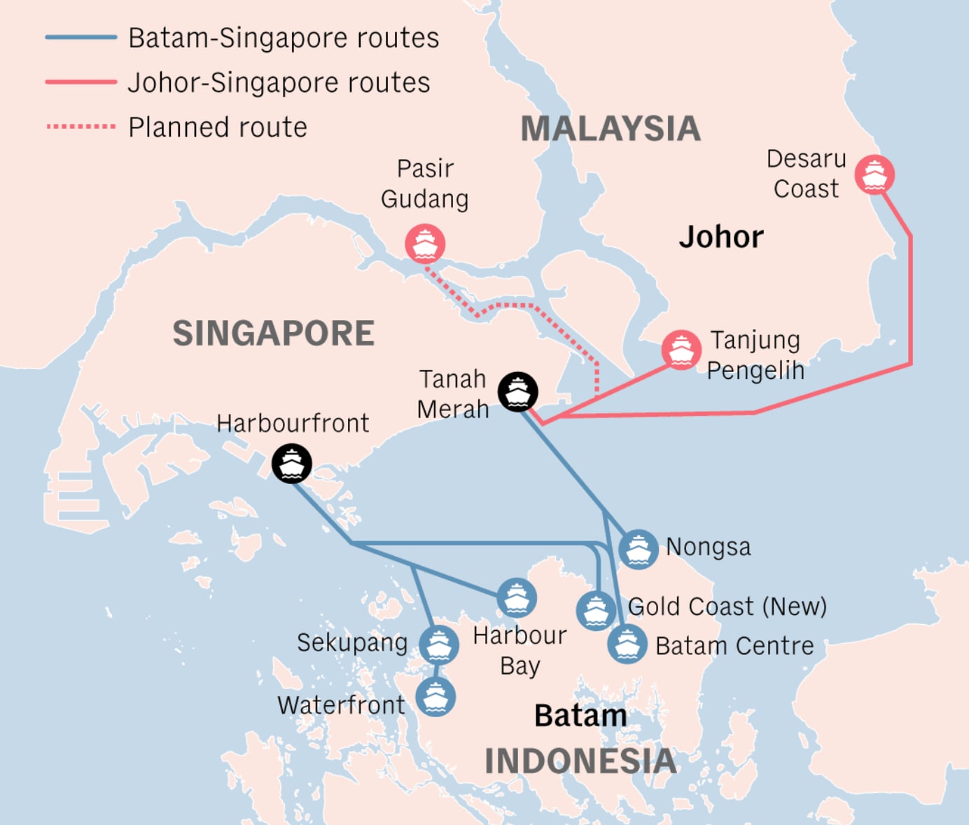 随着新线路加入,新加坡与峇淡岛之间的渡轮连接增至六条,其他码头包括峇淡中心、Harbour Bay、西北部的Sekupang、东北部的Nongsapura及西部的Waterfront。
