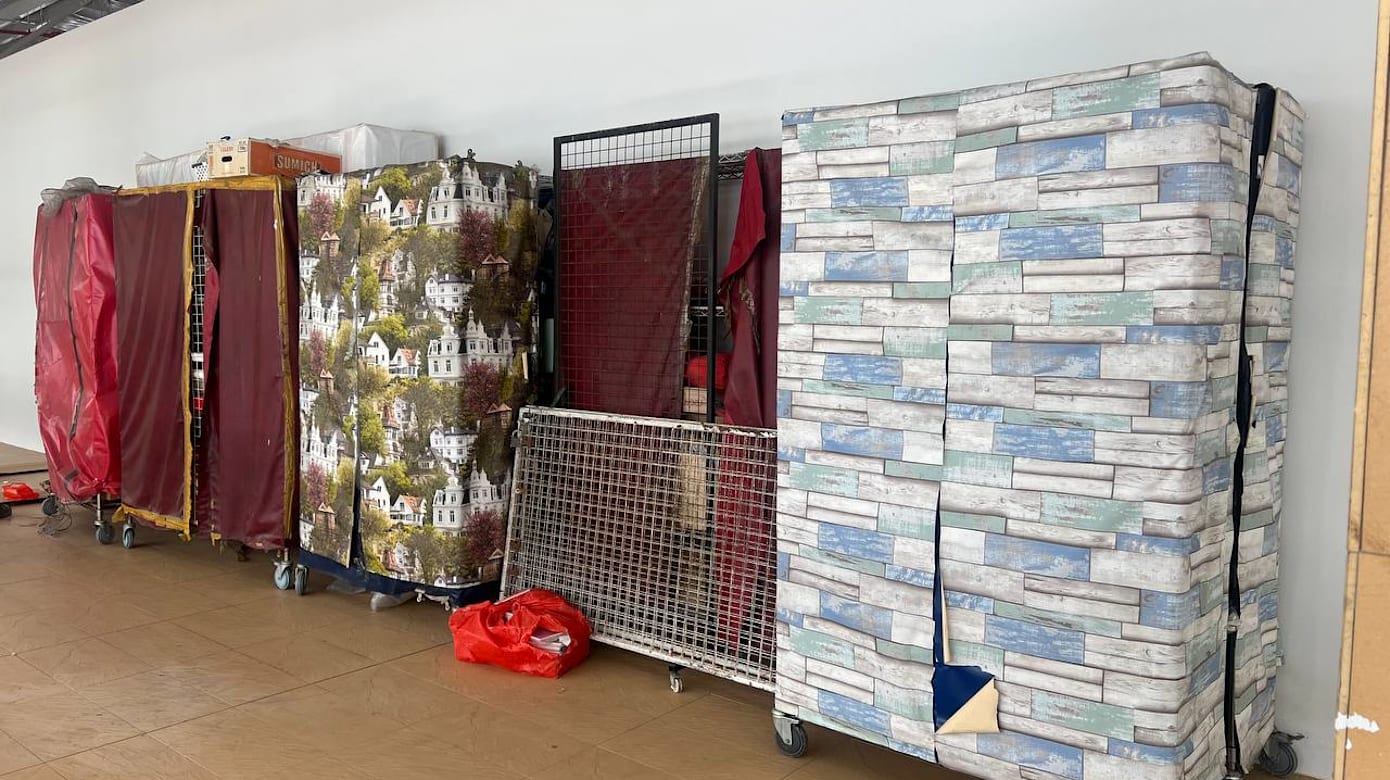 女子的摊位一直紧闭,但她被指在摊位外堆满了各式各样的杂物,包括多个架子、椅子、画作、瓶子等等。(图:王秀喻)