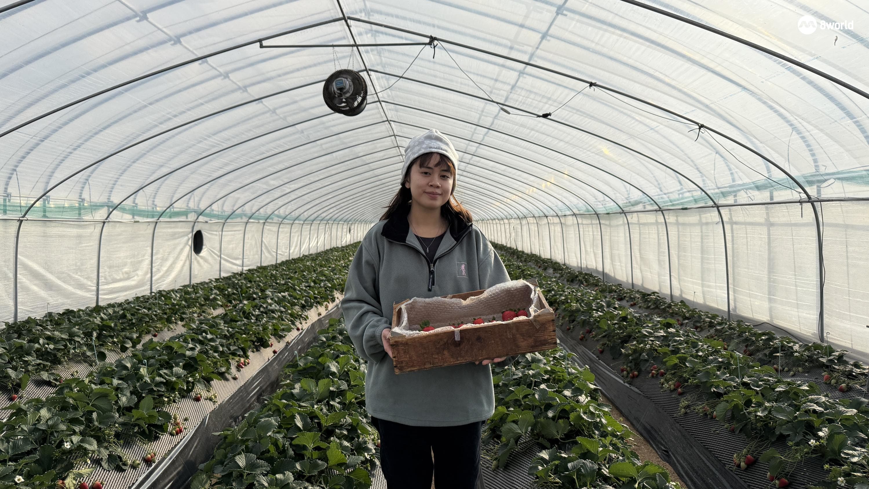 Ryhan在温室里采摘草莓。(图:何婷婷)