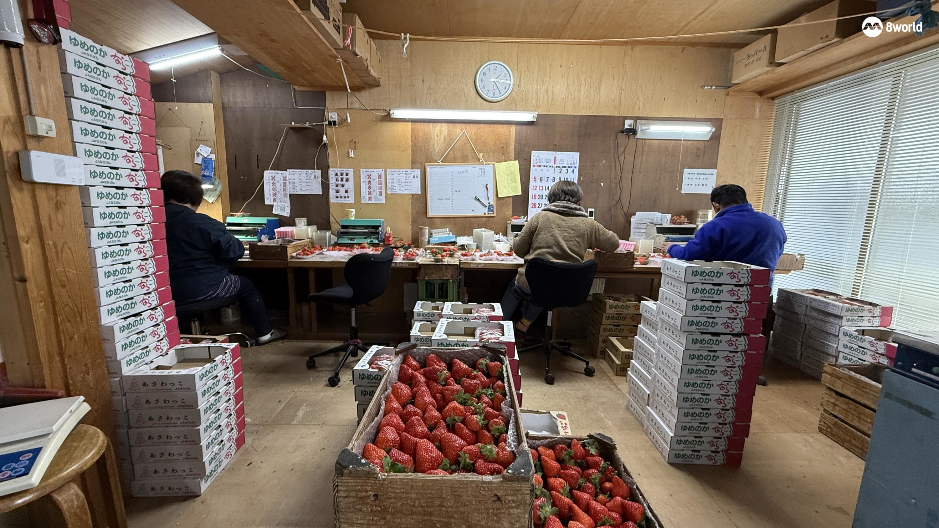村山农场里忙着包装草莓的农民们。(图:何婷婷)