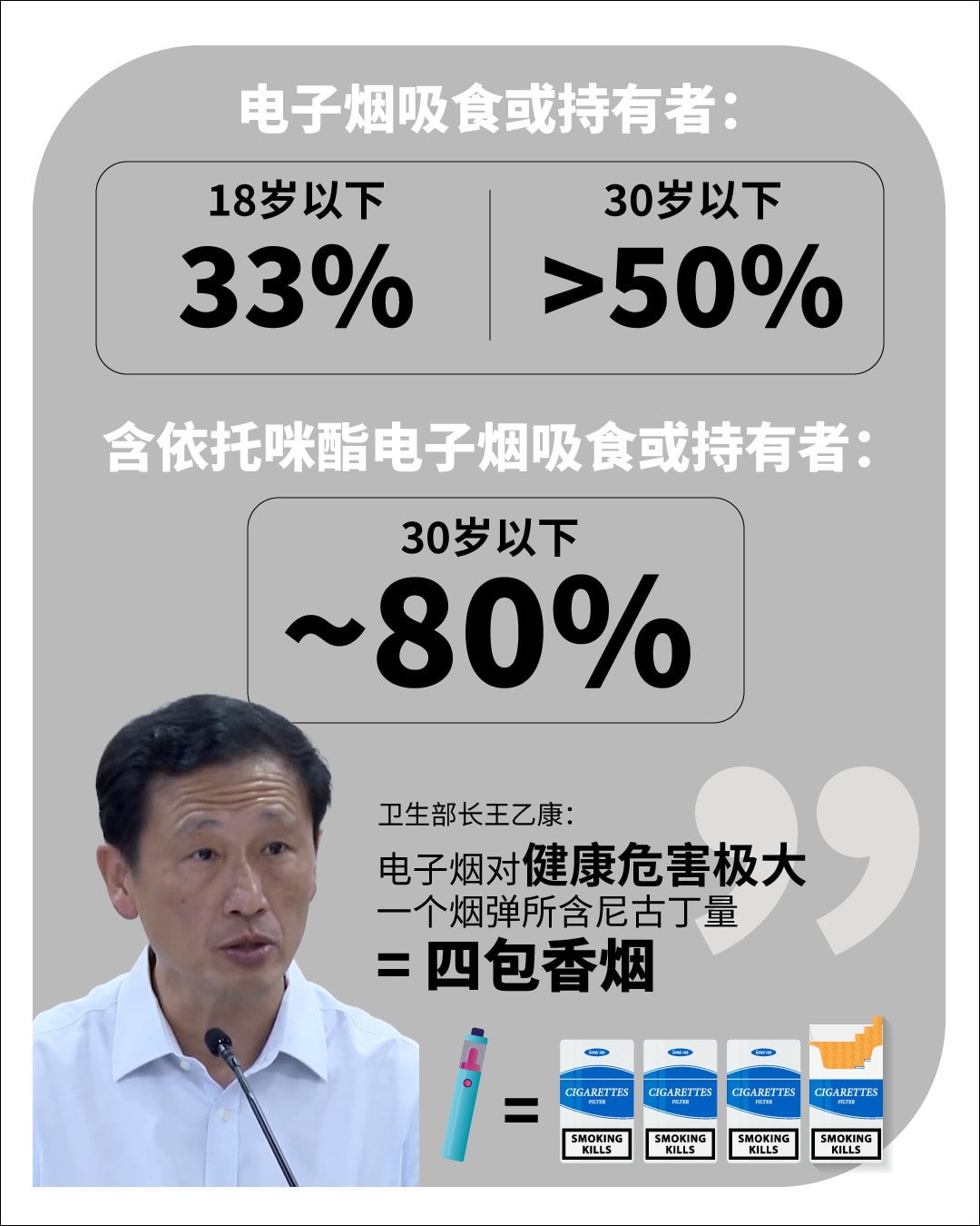 社会政策统筹部长兼卫生部长王乙康指出,滥用电子烟的人当中,有三分之一未满18岁。而滥用俗称“丧尸烟弹”、含依托咪酯电子烟的人,有八成年龄不到30岁。