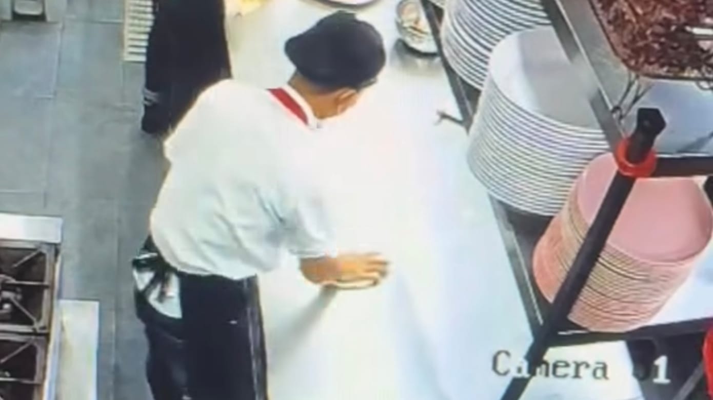 从视频画面可听见两名男子的对话,一人是顾客,另一人是餐馆职员。