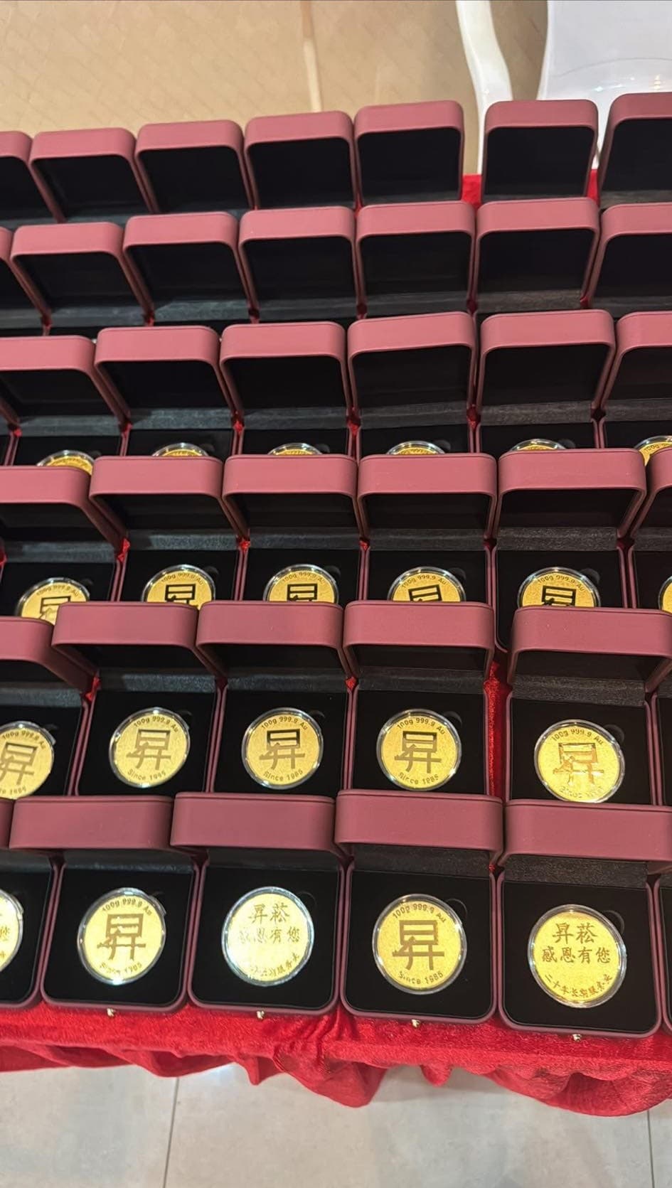 网转照片显示,桌子上摆满了约30个、每个重达100克并印有昇菘集团标志的金币。(图:Facebook/新加坡黄金交流)
