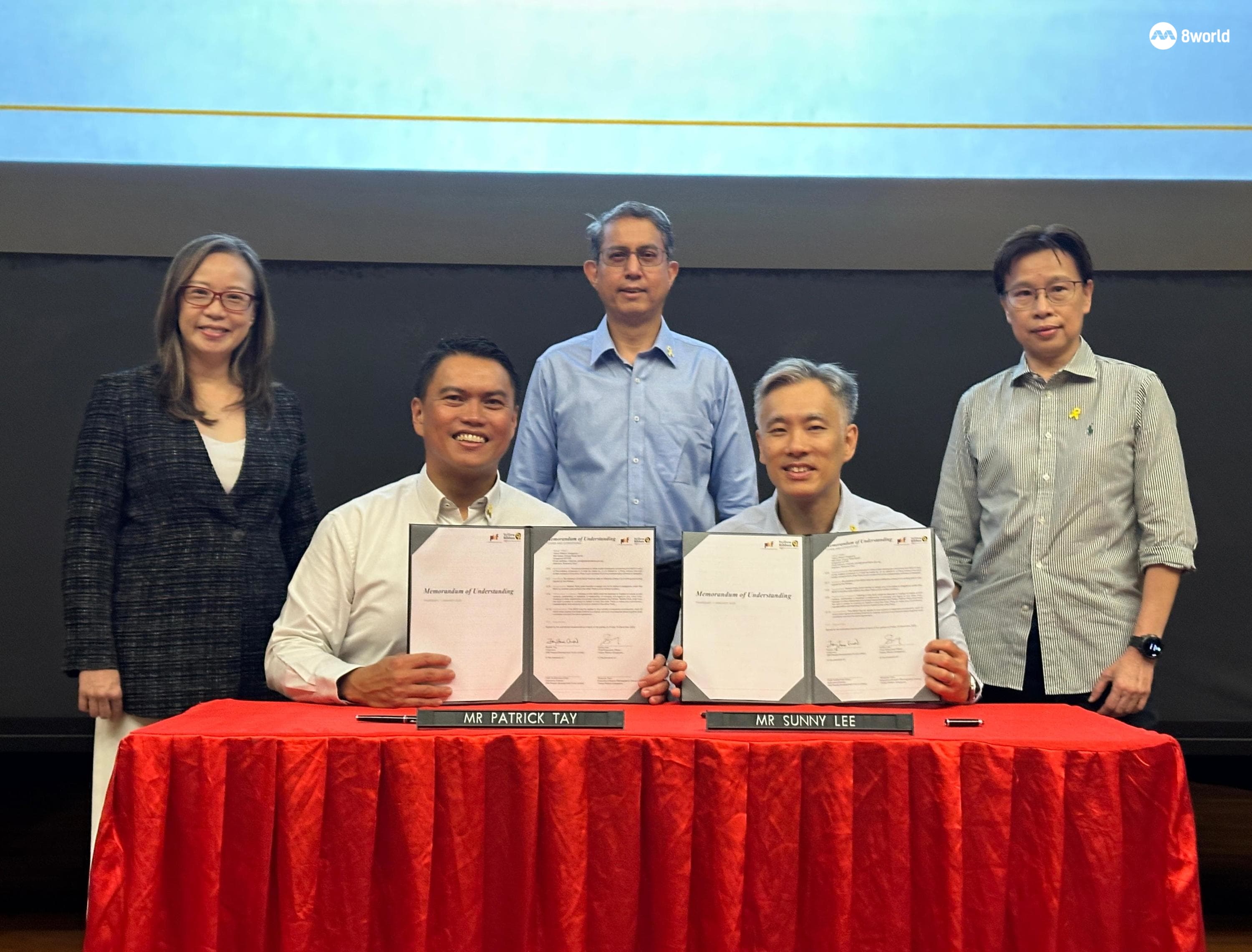 新加坡管理学院人力发展基金主席郑德源与黄丝带新加坡总裁李进丰签署合作备忘录。内政部高级政务部长费绍尔(中)也到场见证。(图:梁居磊)