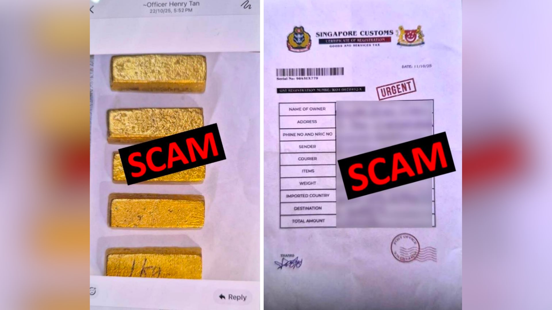 骗子通过 WhatsApp 向受害者发送信息,声称有登记在受害者名下的金条被关税局扣押。(图:新加坡关税局)