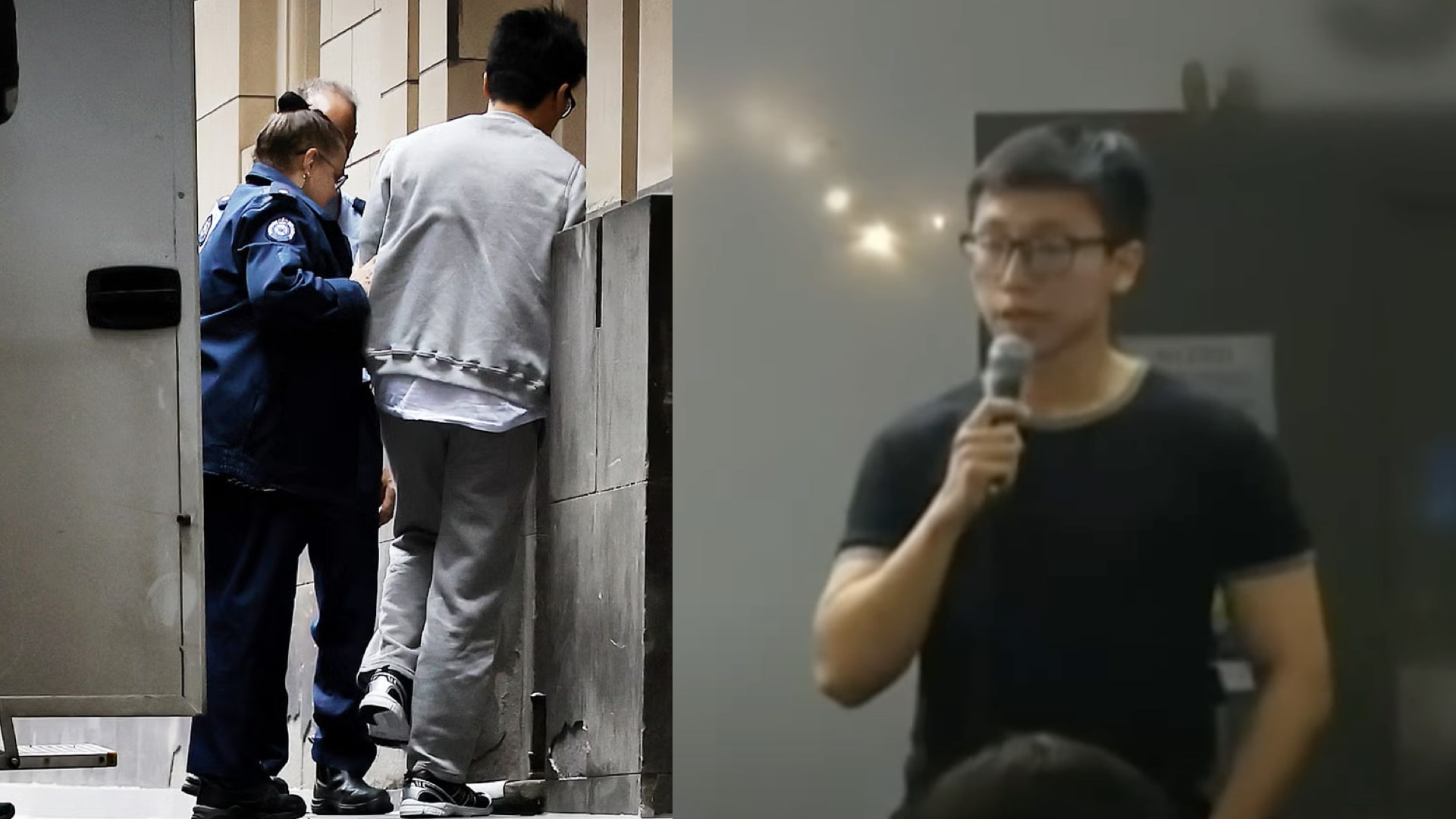 目前是新加坡公民的Ryan Cho在8月22日被押送进入法院。右图为澳洲当地媒体查找,相信是嫌犯求学时期的录像画面截图。(图:澳联社AAP、网络)