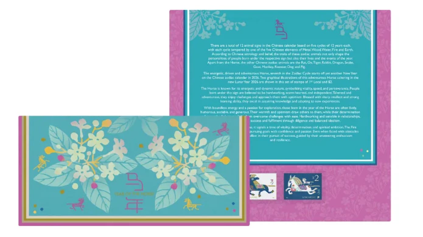 贴有全套邮票并盖上马年特别邮戳的首日封,售价则为4.85新元。附有两枚邮票的纪念套则以5.35新元发售。