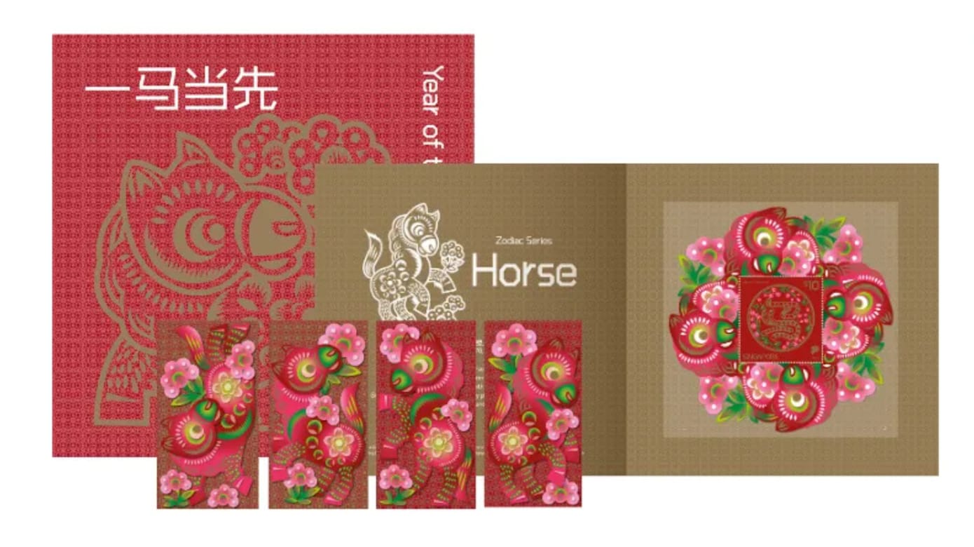 新邮政还推出珍藏版的10元面值马年纪念邮票,同往年相同,纪念版邮票以现代设计风诠释中国传统剪纸。珍藏版邮票售价为19.15新元,附送八个红包封套。