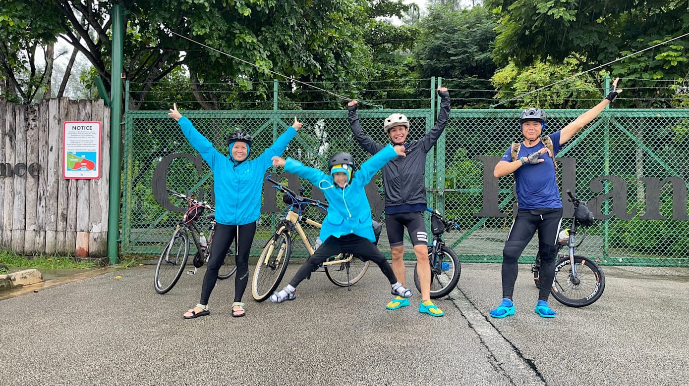 “浩然有几次因骑过人行道上的缝隙式铁盖而脚踏车打滑,跌进灌木丛中。我们有预料到会下雨,但没有想到雨势持续一整天。不过,凉爽的天气也让整个骑行过程更加惬意。浩然喜欢在雨中骑行,整个新加坡都成了他的脚踏车‘水上乐园’。”