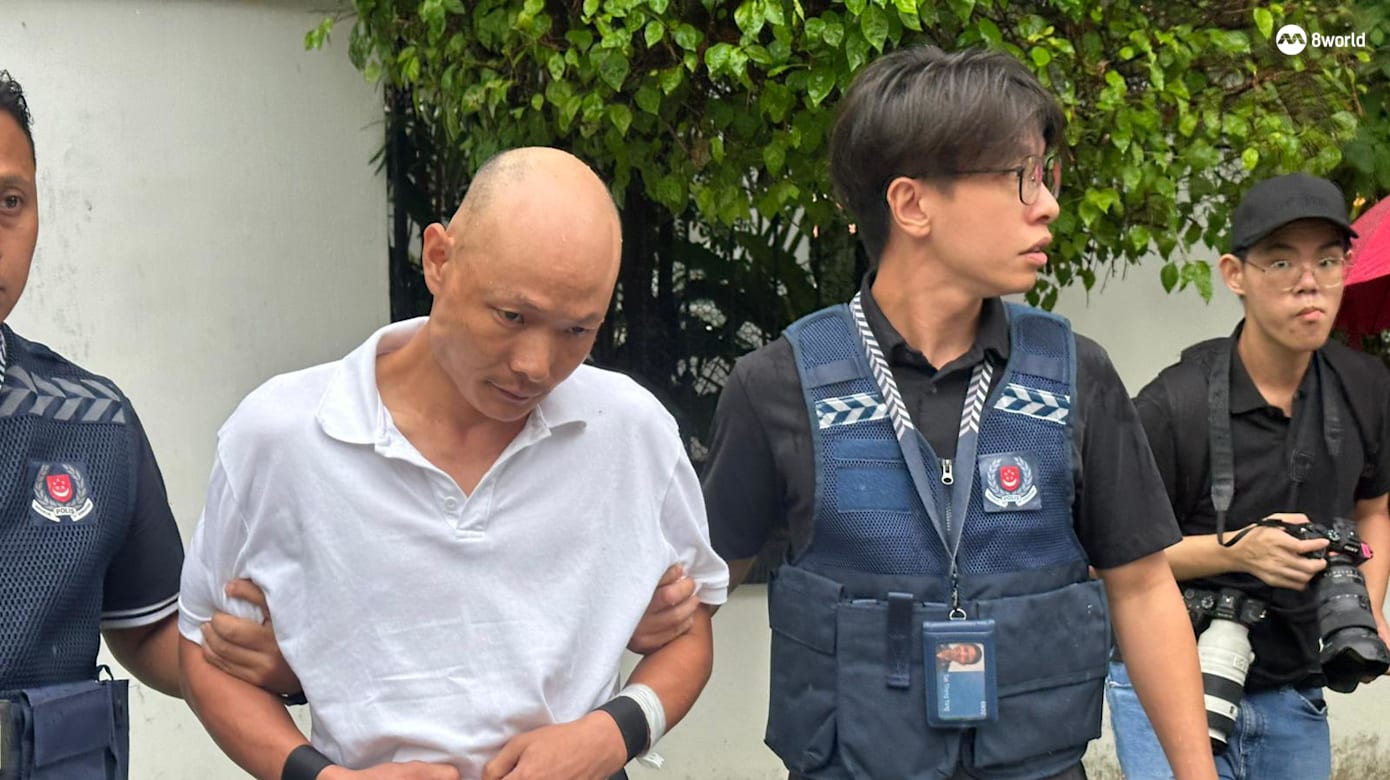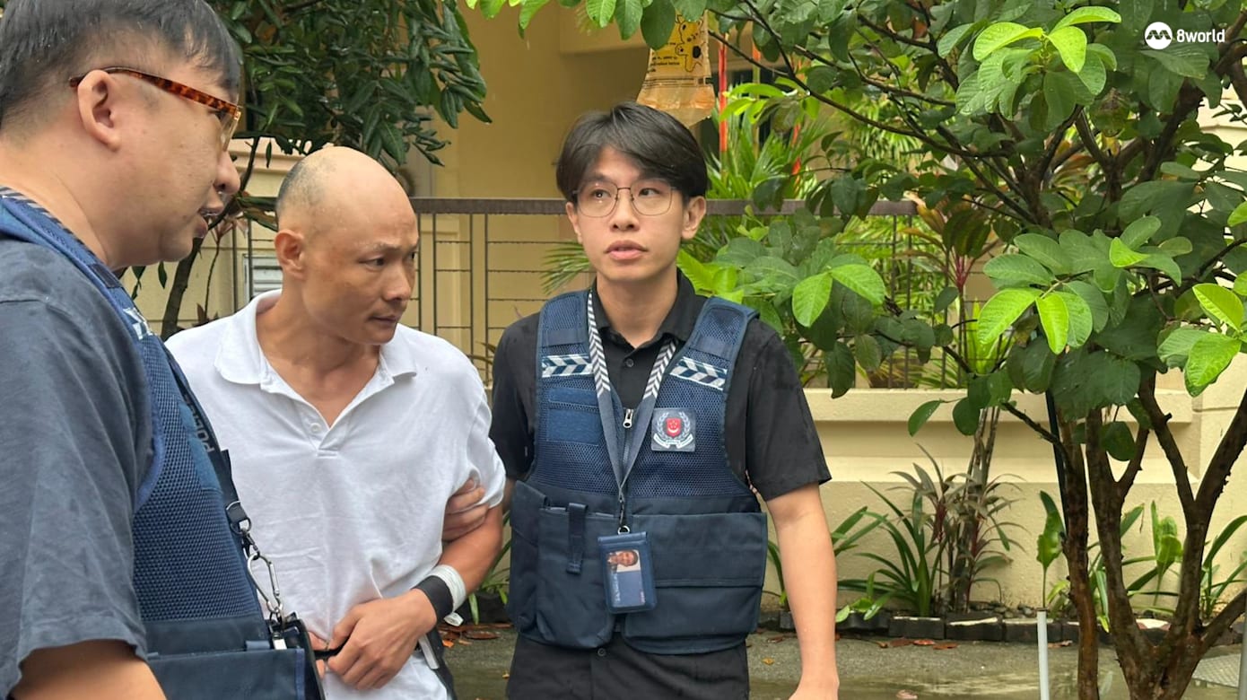 男子是在今天上午10点56分左右被警方载到现场,他身穿白色上衣和深蓝色短裤,在三名警员的带领下回到干案的住宅区。