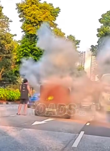 宝马轿车路中央引擎起火,巴士车长英勇助灭火获表扬。(图:Facebook/ROADS.sg)