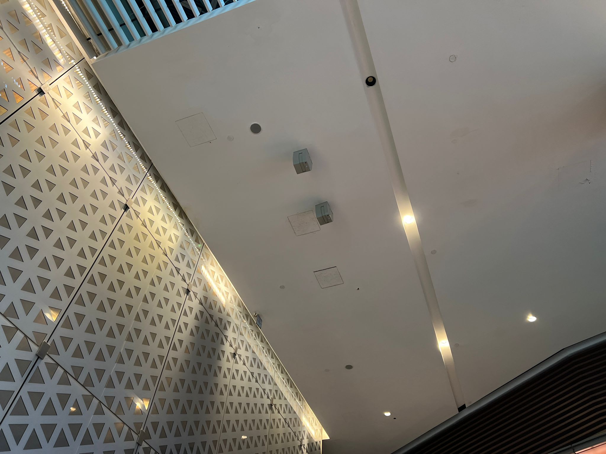 她拍摄的视频显示,5、6米高的天花板上有个灰色喷头,斜着向下喷射出一道白色的水柱。