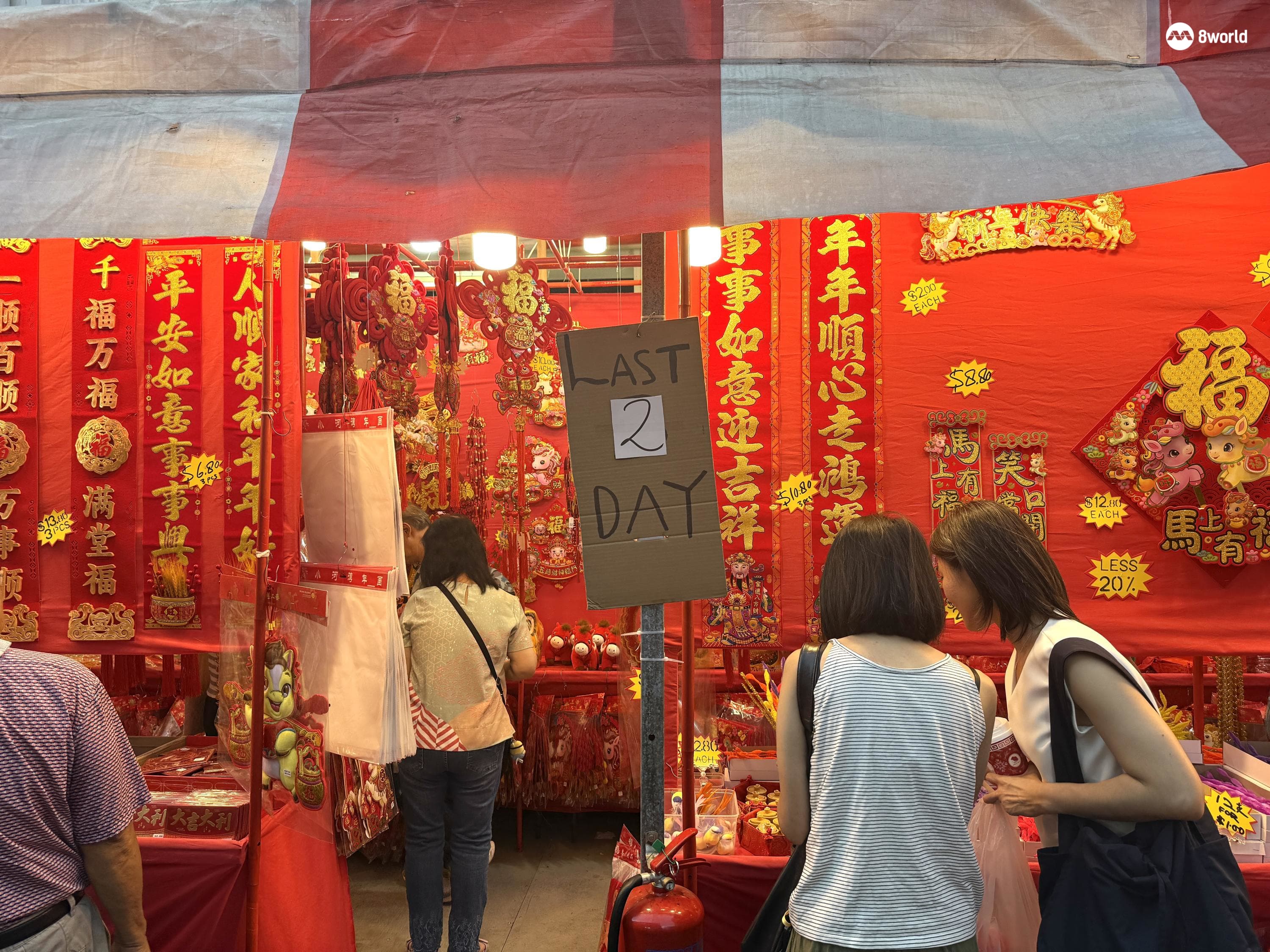 《8视界新闻网》记者今天(14日)下午走访牛车水年货市场时发现,史密斯街和登婆街一度水泄不通,一些摊贩已开始降价促销,不少民众纷纷提着购物袋满载而归。