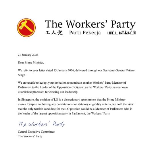 工人党中央执行委员会也在回复给黄总理的信函说明:“我们无法接受您提名另一位工人党国会议员担任反对党领袖的邀请,因为工人党有自己既定的领导层选举程序。”